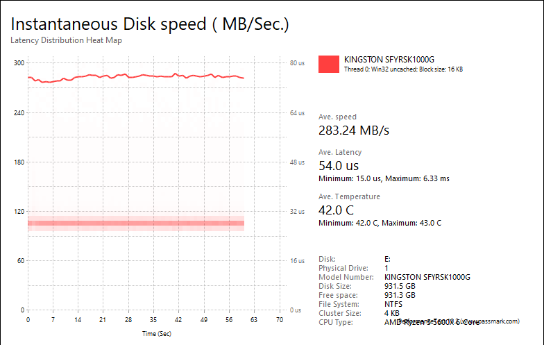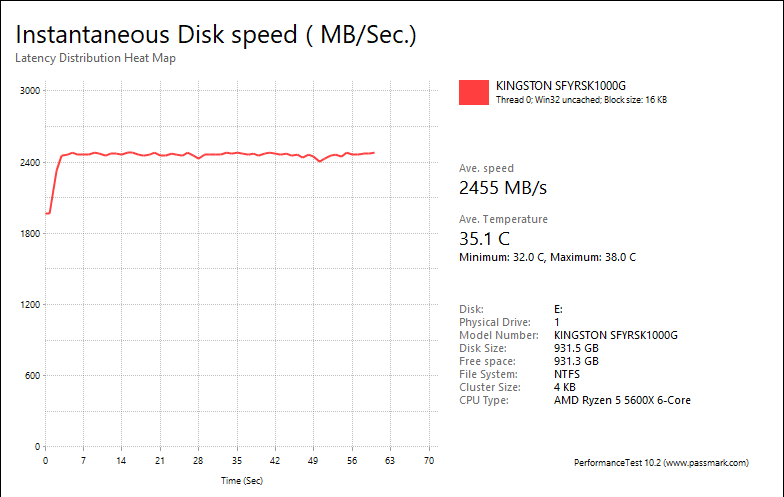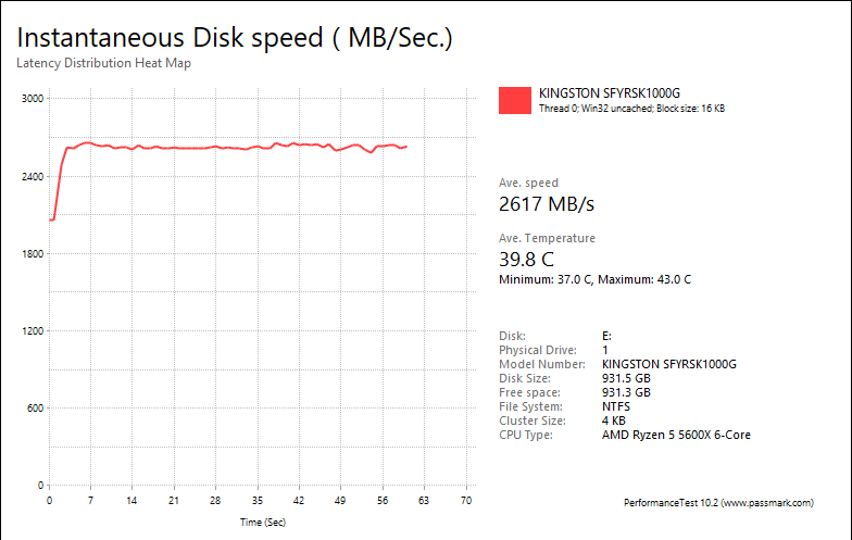 PassMark PerformanceTest 10's Advanced Disk Test, unlike HD Tune Pro 5.70, generates some awesome graphs right out of the box. It also provides valuable insight in simulating real world performance applications. To make things clear to you, the first graph simulates a database server, followed by a file server, web server, and workstation. Obviously, PassMark PerformanceTest 10 uses highly compressible data in most tests some controllers can really take advantage of. However, it also requires high IOPS capabilities for the best score. One thing clear is the Kingston FURY Renegade 1TB provided generally flat graphs, which is excellent if you are looking for consistent performance.