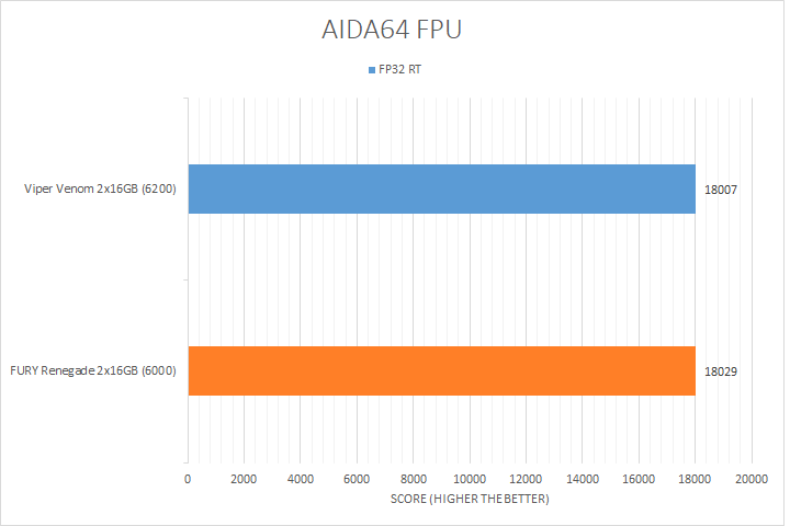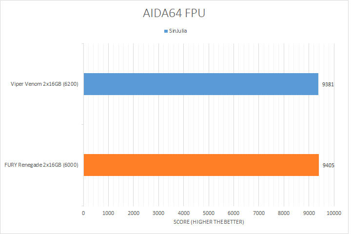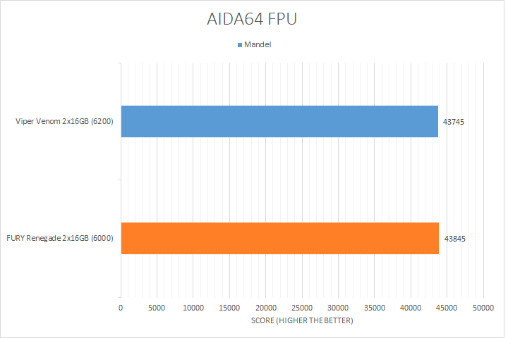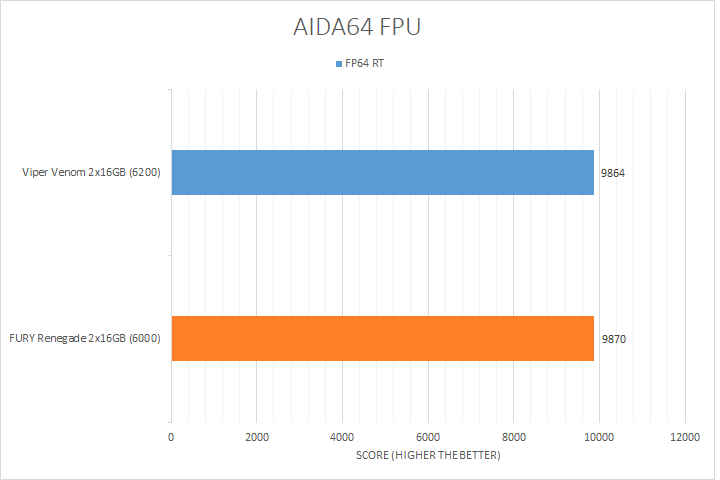 As seen in other memory reviews, floating point unit benchmarking is usually not the most exciting set of tests to run. This is because these tests are mostly dependent on the test system's processor, so parameters such as RAM latencies or clock speed ultimately do not make a huge difference. This is further proved by the results, where the two memory sets had very little differences in scores. Like the CPU tests, the Kingston FURY Renegade DDR5-6000 2x16GB had results very close to the Patriot Viper Venom RGB DDR5-6200 2x16GB. It is important to note the difference here is essentially negligible. It is unfair to make a strong evaluation of the FURY Renegade based on these benchmark results alone, so let us move on to the more relevant memory tests.