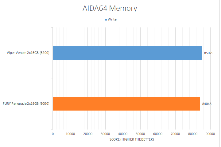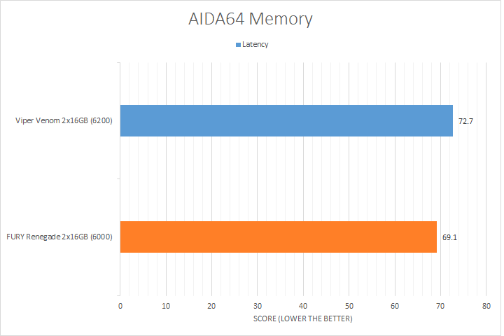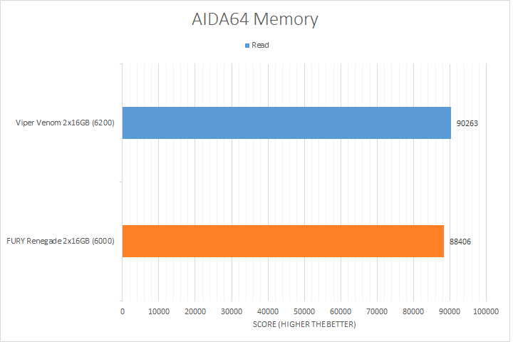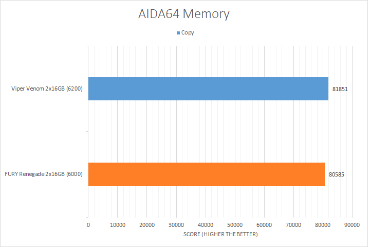 Next up for benchmarking comparisons are AIDA64's synthetic memory tests. These tests are much better for benchmarking memory, and the results usually reflect the difference in latencies and bandwidth. Traditionally, higher memory bandwidth RAM kits are favored on these tests, with memory bandwidth having more influence than the timings. The Kingston FURY Renegade DDR5-6000 2x16GB fell below the Patriot Viper Venom RGB DDR5-6200 in the read, write, and copy tests. However, this is to be expected, since the FURY Renegade has a lower operating frequency. The lower latencies came into play here as well, with the FURY Renegade having the better result in the latency benchmark. Overall, all the results were still very close.