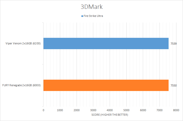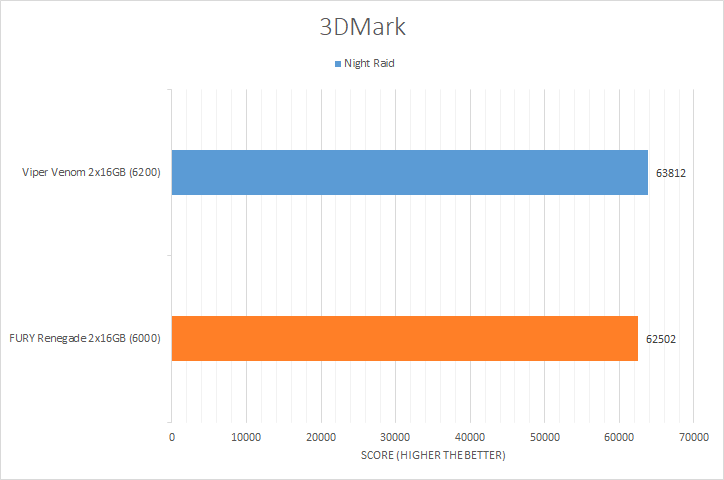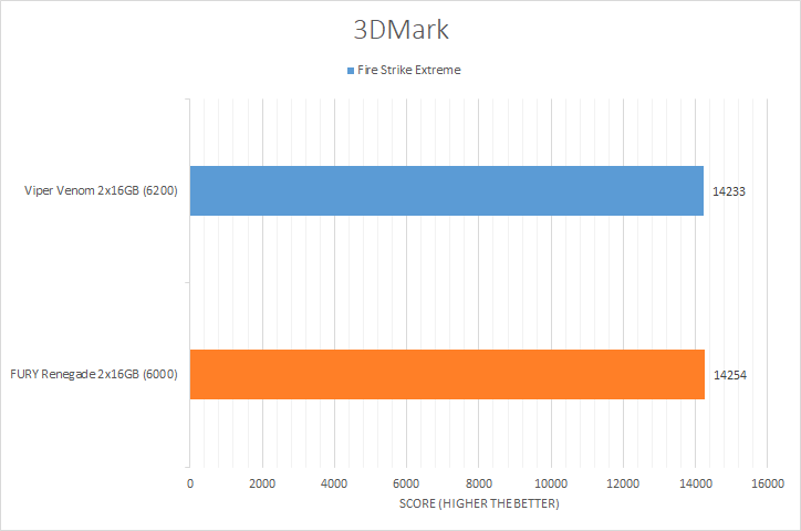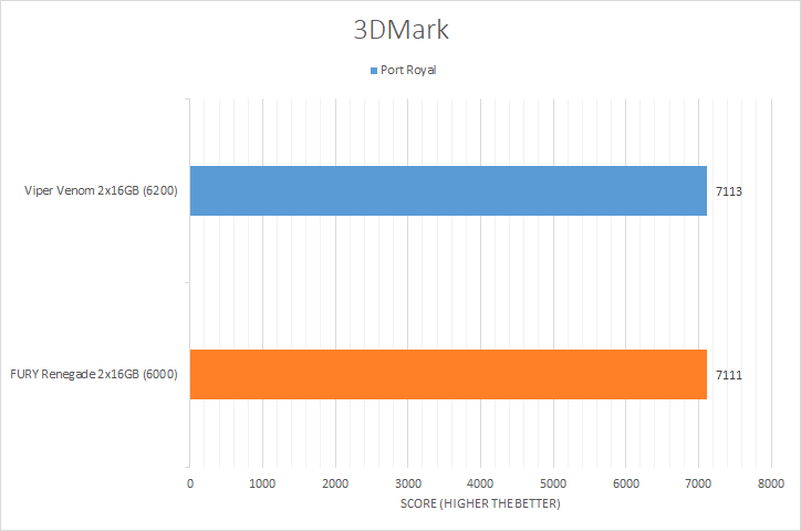 3DMark has been around long enough to earn a solid reputation with PC enthusiasts all around the internet. The unique selection of graphic test benchmarks makes for good tests to run on your PC. The benchmark tests chosen, in decreasing GPU dependencies, were Time Spy Extreme, Port Royal, Fire Strike Ultra, Fire Strike Extreme, and Night Raid. Looking at the results, we can see both memory kits performed around the same margin with Night Raid being the exception, where the Patriot Viper Venom RGB DDR5-6200 2x16GB took a more noticeable lead. The Kingston FURY Renegade DDR5-6000 2x16GB took the lead in the Fire Strike Extreme, Fire Strike Ultra, and Time Spy Extreme benchmarks, even if only by a small margin.