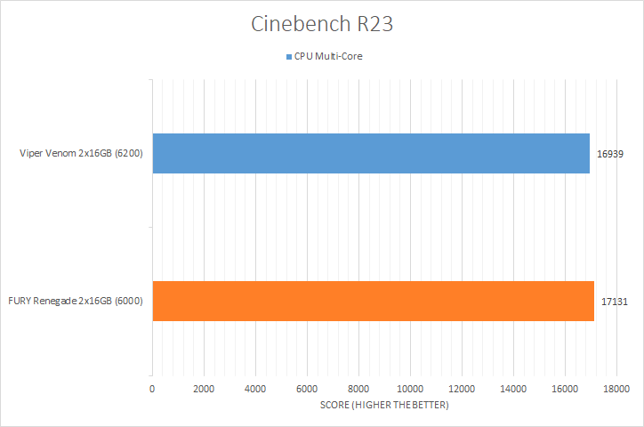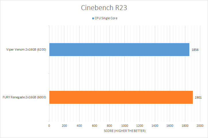 Cinebench R23 is Maxon's latest benchmark to measure CPU rendering performance. Unlike Cinebench R20, Cinebench R23 has a single-core and multi-core processor test. As its names suggest, this test depends heavily on the CPU, but it does not necessarily mean memory kits will not contribute anything. Looking at the results, we can see the Kingston FURY Renegade DDR5-6000 2x16GB outperformed the Patriot Viper Venom RGB DDR5-6200 2x16GB in both CPU tests. Like all the other benchmarking tests though, the results between the two memory kits were very close.