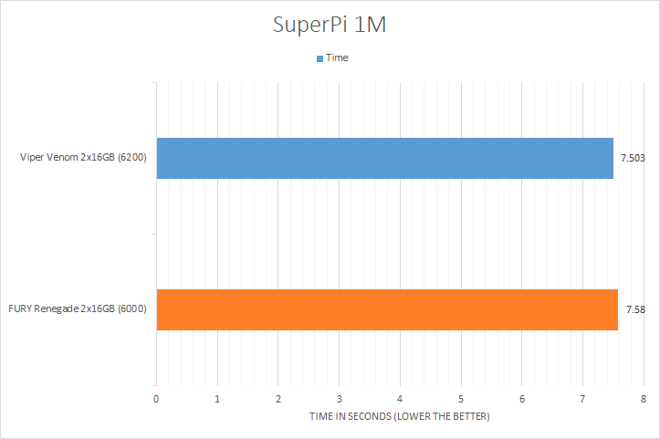 We have always included SuperPi in our benchmark results, because it is a quick and dirty run that always proves to be interesting. It is neither the fastest way to calculate Pi nor is it the most challenging. Being an enthusiast at heart, this program has always provided interesting results for showing off your overclocking prowess on your favorite online platform. The Kingston FURY Renegade DDR5-6000 2x16GB had a slower time at 7.58 seconds versus the Patriot Viper Venom RGB DDR5-6200 2x16GB score of 7.503 seconds. The difference is negligible though, with it only being 0.077 seconds.