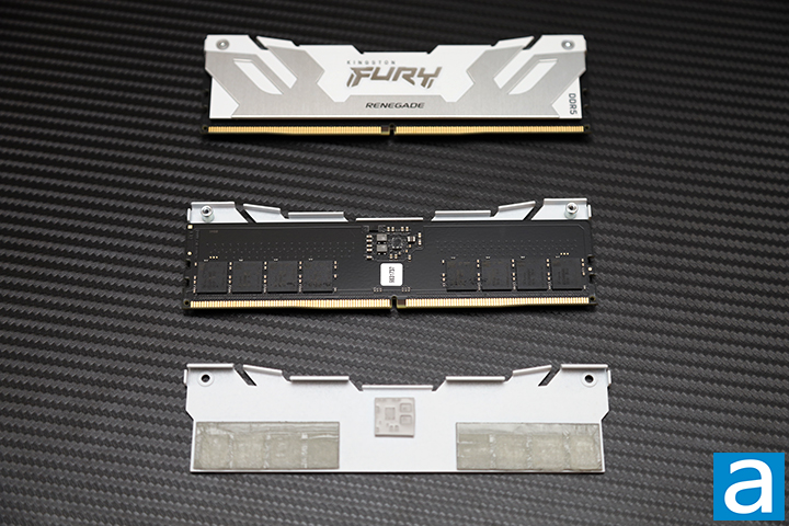 As you can see more clearly in our photo above, the Kingston FURY Renegade DDR5-7200 2x16GB has a very nice black PCB. We can also spot the power management integrated circuit, commonly abbreviated as PMIC, near the center. Its heatspreader on top is composed of two separate pieces. The heatspreaders are held to the module itself by multiple strips of thermally conductive adhesive and physically locked together by two screws. The adhesive force between the two heatspreaders and memory ICs is very strong as always from the company, so if you ever do take them off, keep your hair dryer around.