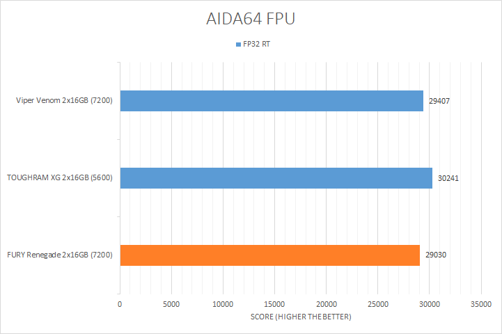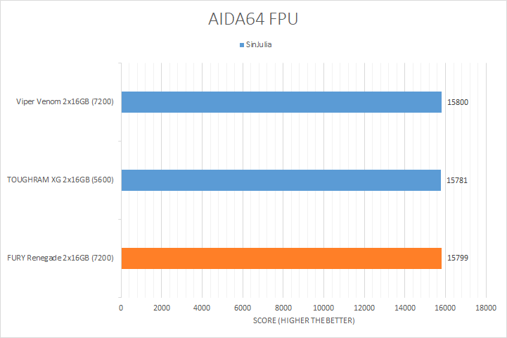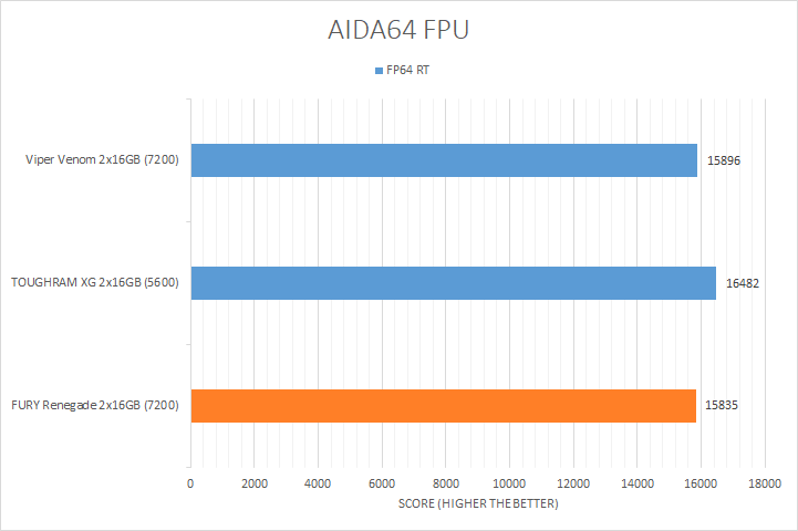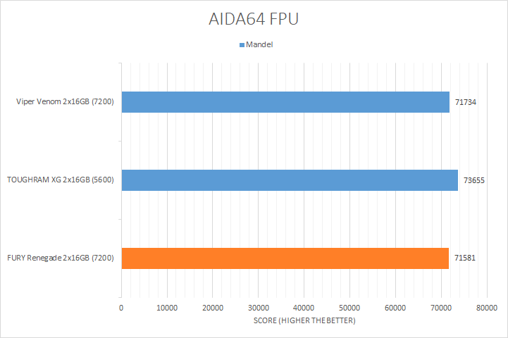Usually, AIDA64's FPU benchmarks are the least exciting of all when writing a RAM review. This is because the way results are obtained is usually highly dependent on the tested processor, so much to an extent that the outcome is typically irrelevant to the speed or latencies of the installed memory modules. As you can see in our graphs above, all the results were within a few percent of each other. There were three results where the difference was more noticeable, which were the Mandel, FP32 RT, and FP64 RT tests. The highest bandwidth FURY Renegade and Viper Venom were measurably slower than the Thermaltake TOUGHRAM XG RGB D5 DDR5-5600 2x16GB, which was surprising. At the end of the day, they were almost all reasonably within the same ballpark as each other.