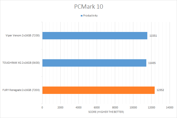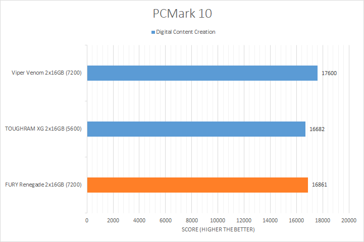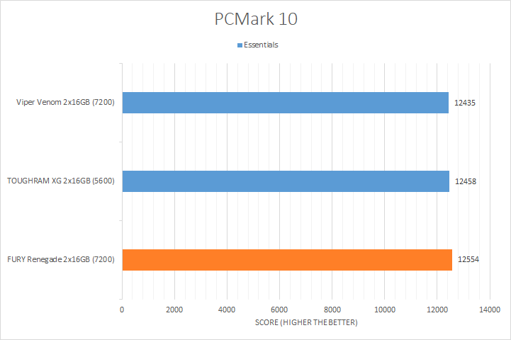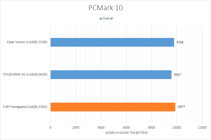 PCMark 10 is the latest version of the popular full system benchmark from UL. A standard benchmark run provides scores in three categories, which includes Essentials, Productivity, and Digital Content Creation. Wrapping up all three categories is an overall score in the end. This is a synthetic test that aims to emulate real-world conditions, which provides interesting insight to the performance of your system. There was some minor variance in the results of the tested kits, which you can see in our graphs above. Regardless, the DDR5-7200 kits consistently scored a little bit better than the DDR5-5600 kit with the exception of the Essentials test. The Kingston FURY Renegade DDR5-7200 2x16GB consistently traded blows with the Patriot Viper Venom DDR5-7200 2x16GB despite being rated at the same speed but higher latencies.