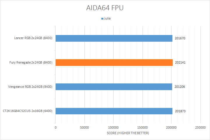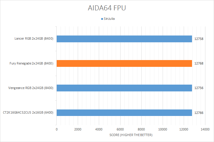 Usually, AIDA64's FPU benchmarks are the least exciting of all when writing a RAM review. This is because the way results are obtained is usually highly dependent on the tested processor, so much to an extent that the outcome is typically irrelevant to the speed or latencies of the installed memory modules.