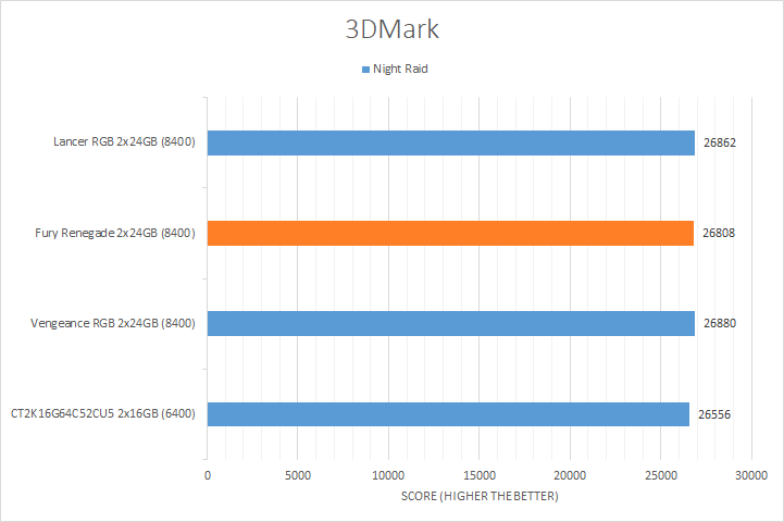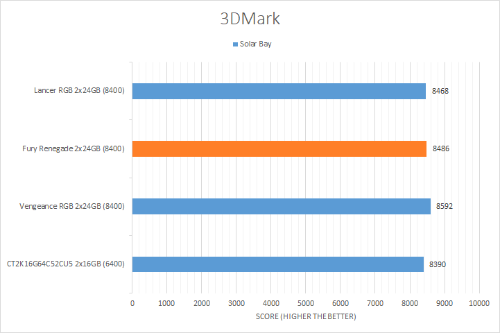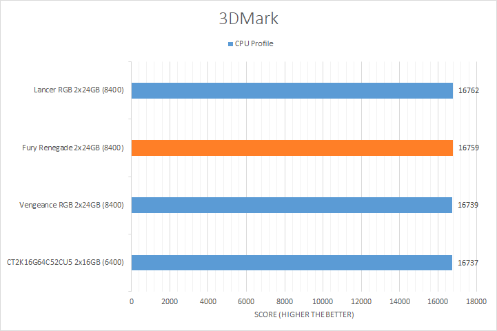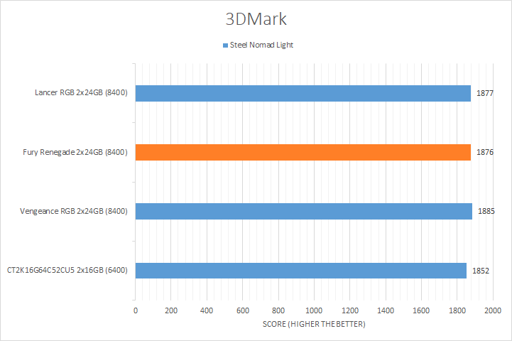 As you can see in our graphs above, the Corsair Vengeance RGB DDR5-8400 2x24GB, Kingston FURY Renegade DDR5-8400 2x24GB, XPG Lancer CUDIMM RGB DDR5-8400 2x24GB, and Crucial CT2K16G64C52CU5 DDR5-6400 2x16GB remained close to each other, showing memory bandwidth played a relatively minor role in these tests.