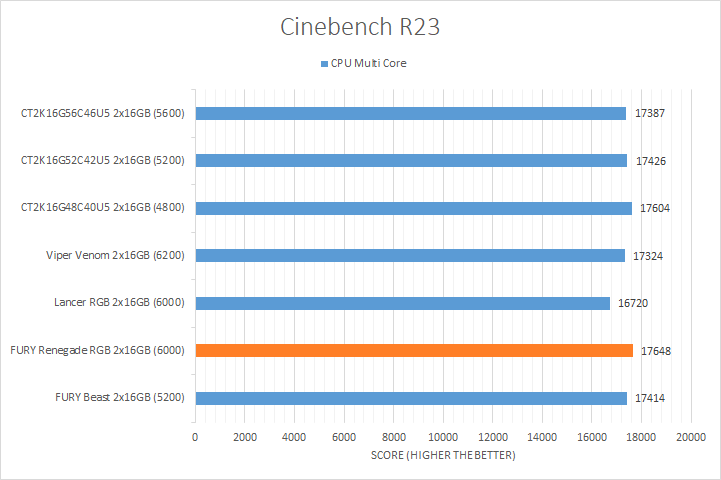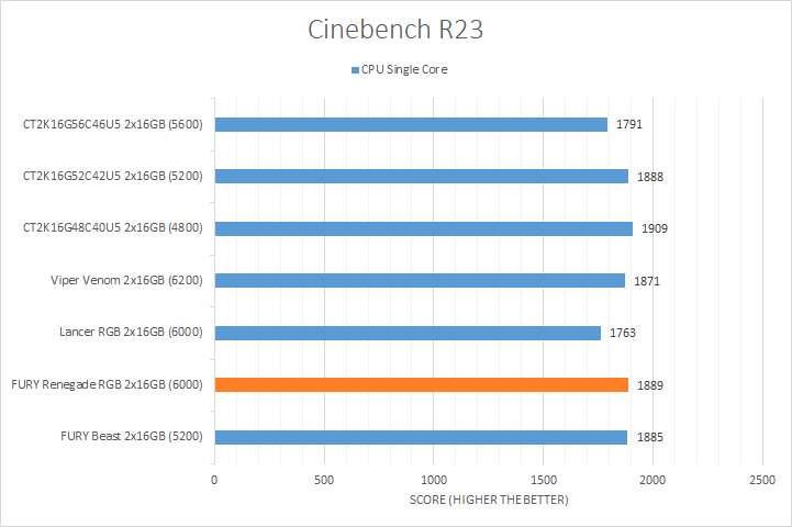 Cinebench R23 is Maxon's latest benchmark to measure CPU rendering performance. Two CPU tests were conducted; one using only one core on my Intel Core i5-12600K, while the other utilizes all available cores. Obviously, having a fast processor will play a significant role in determining these scores, but that does not mean RAM does not do anything at all to contribute to these results. As you can see in our charts above, the results seem to be all over the place with little correlation to the memory bandwidth. In this case, the Kingston FURY Renegade RGB DDR5-6000 2x16GB came in first, but as with many of our other tests, the difference between all the tested kits was not significant.