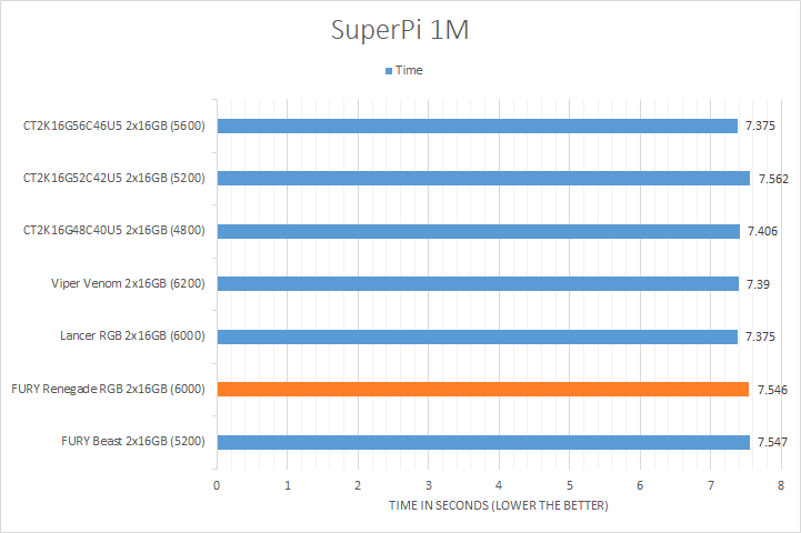 We have always included SuperPi in our benchmark results, because it is a quick and dirty run that always proves to be interesting. It is neither the fastest way to calculate Pi nor is it the most challenging. But being an enthusiast at heart, this program has always provided interesting results for showing off your overclocking prowess on your favorite online outlet. This time around, the Kingston FURY Renegade RGB DDR5-6000 2x16GB came in near the back of the pack, which was surprising.