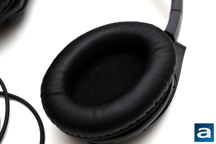 Moving up the cord, the next thing we come to are the two earcups on the Kingston HyperX Cloud Stinger. Much like we have seen from the other Kingston headsets, we have a very plushy earmuff, with leatherette covering and memory foam underneath. The end result is a very comfortable over-the-ear design. The leatherette makes contact with only the side of your head and not your ear. Even as a glasses wearer, the Kingston HyperX Cloud Stinger always felt comfortable resting on the side of my head. The oval shape also conforms naturally to a person's ear. Inside the earcups, you can find a thin mesh lining to ensure if your ear does not touch any plastic. Underneath this area are the 50mm neodymium drivers. They feature a frequency response of 18Hz to 23kHz. While humans can generally only hear from 20Hz to 20kHz or less, we can often still feel the effects of the inaudible frequencies on both ends of the spectrum. We will see how this actually affects the sound quality in our audio analysis. Rated impedance of this unit is 30 ohms.