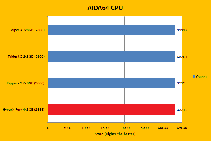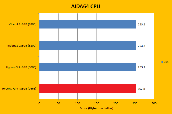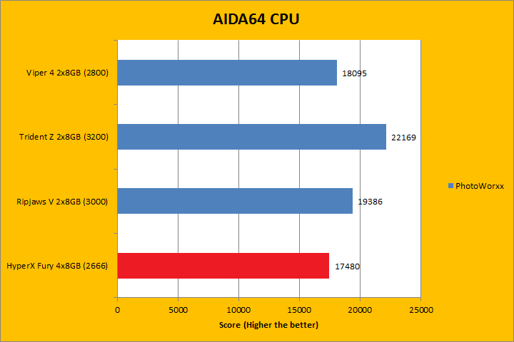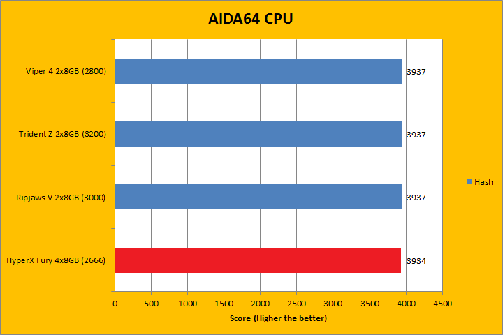As always, our first set of benchmark results presented on the table are data obtained using AIDA64 CPU tests. Version 5.30.3500 (The latest release at press time; which can be downloaded from our Downloads page) results are comparable to recent previous releases. It was quite interesting how the products compared, because we had a varying combination of speed, capacity, and latencies. As far as how their performance went, all of them were extremely close to each other, with the Kingston HyperX Fury HX426C15FBK4/32 4x8GB sitting at where we expected it to be. AIDA64 did not gain much from stepping up your memory speed, with the exception of the PhotoWorxx results -- where higher bandwidth units had an advantage.