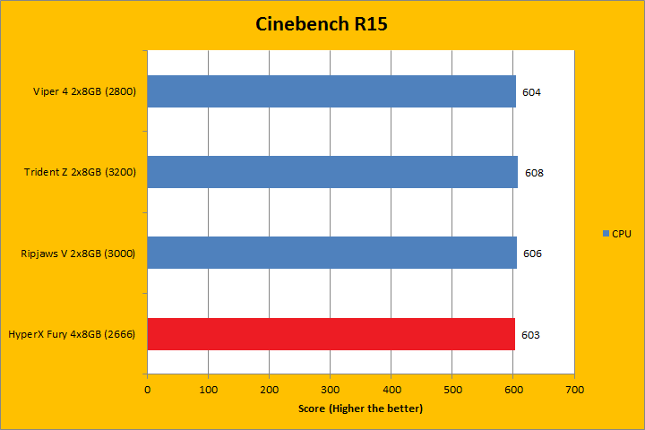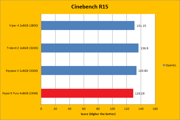 Cinebench R15 is separated into two tests: One tests the CPU image rendering performance, while the other benchmarks the OpenGL video rendering performance. Obviously, having a fast processor and a powerful video card, respectively, will play a much more significant role in determining these scores, but that does not mean RAM does not do anything at all to contribute to these results. As you can see in our charts above, the Kingston HyperX Fury HX426C15FBK4/32 4x8GB did well in both tests; holding its own against faster kits in the CPU and OpenGL results. That said, it is important to point out all of the tested kits came out extremely close to each other, despite frequency variance of approximately 534MHz between the fastest and slowest.