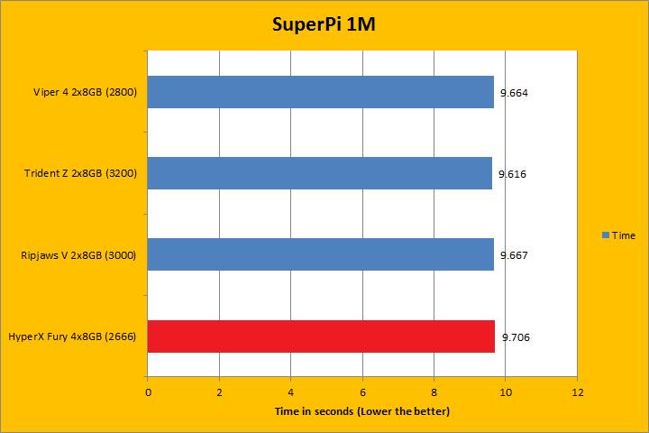 We have always included SuperPi in our benchmark results, because it is a quick and dirty run that always proves to be interesting. It is neither the fastest way to calculate Pi, nor is it the most challenging. But being an enthusiast at heart, this program has always provided interesting results for showing off your overclocking prowess at your favorite online forum. This time around, the Kingston HyperX Fury HX426C15FBK4/32 4x8GB lost by a small fraction of a second against the rest, but only because it was tested against faster memory modules.
