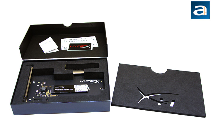 Out of the box, you will be greeted by piece of black foam with the stylized HyperX logo cut into it. Taking the black foam cover out will reveal a tray made out of the same material containing the Kingston HyperX Predator PCIe 480GB SSD, which, in this particular configuration, consists of an M.2 module pre-installed on a PCI Express adapter card. For about $10 less at press time, you can go without the adapter card, and get the drive in M.2 form only. There is no anti-static bag for the product. Other than the SSD, you will receive a low profile bracket for the HHHL board, HyperX sticker, small "Getting Started" poster, and an Acronis True Image HD activation key. It is really everything you need to get going, and personally, I do not have any complaints in this regard.