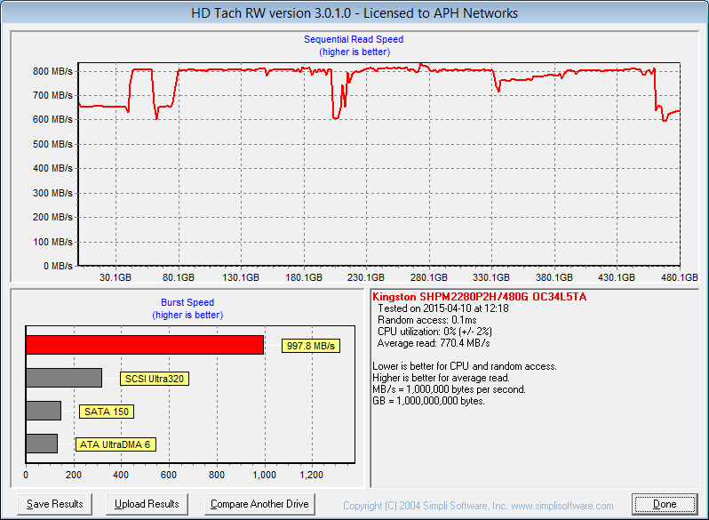After giving the Kingston HyperX Predator PCIe 480GB a clean format and ensuring alignment and everything is correct, I fired it up for some testing in HD Tach. While HD Tach is more of a 'drag race' than a clear indication of real life performance, and has been around for a really long time, it is an excellent storage performance reference among SSDs with the same controller, and has been our favorite benchmark long before hard drives even cracked the 50MB/s mark. With an average read speed of 770.4MB/s according to HD Tach in single disk configuration, this is by far the best score we have ever seen here at APH Networks (The SanDisk Ultra II 240GB is the fastest single SATA 6Gb/s disk at 469.3MB/s). For most solid state drives, we typically look for something that is faster than 350MB/s. From our experience, most drives do not crack the 400MB/s line. At the end of the day, HD Tach may not be the best test for solid state drives all the time, but we really cannot argue against the results.