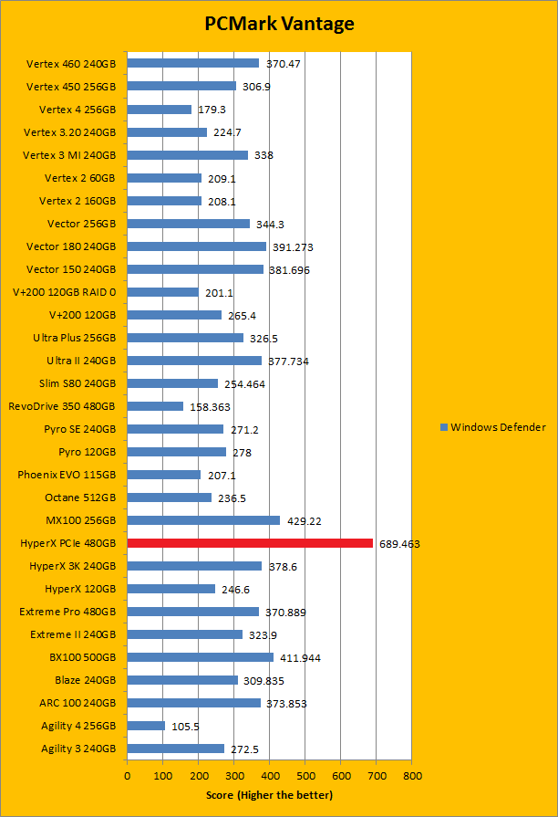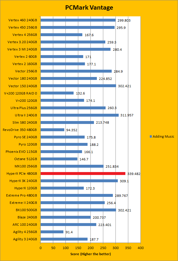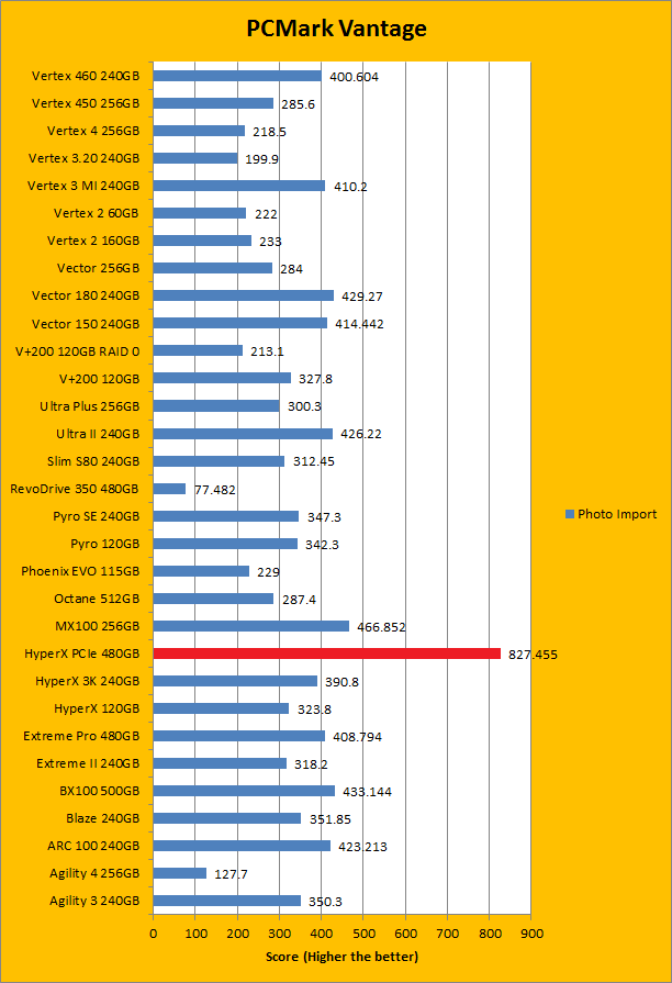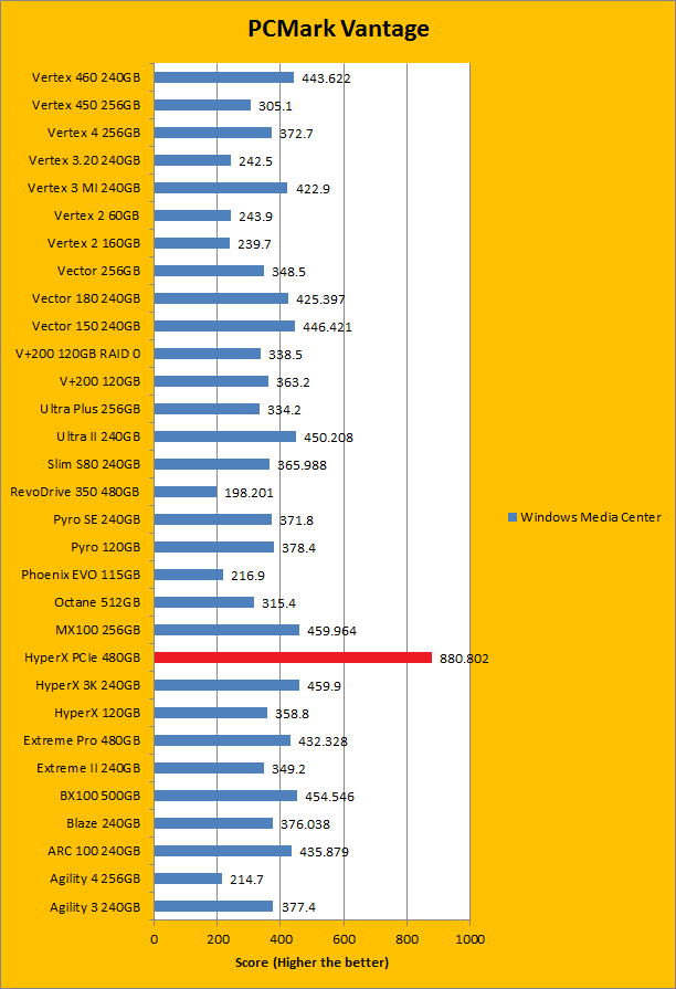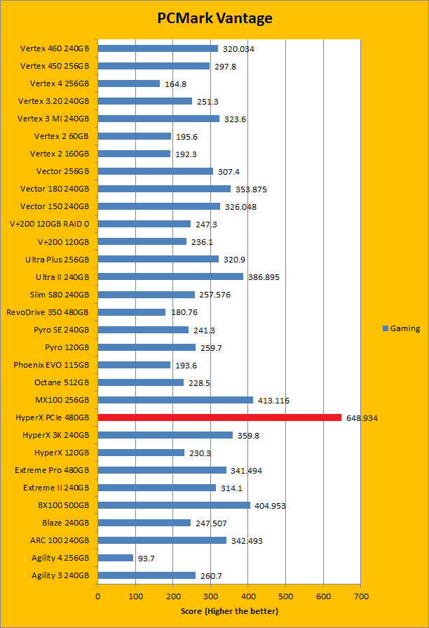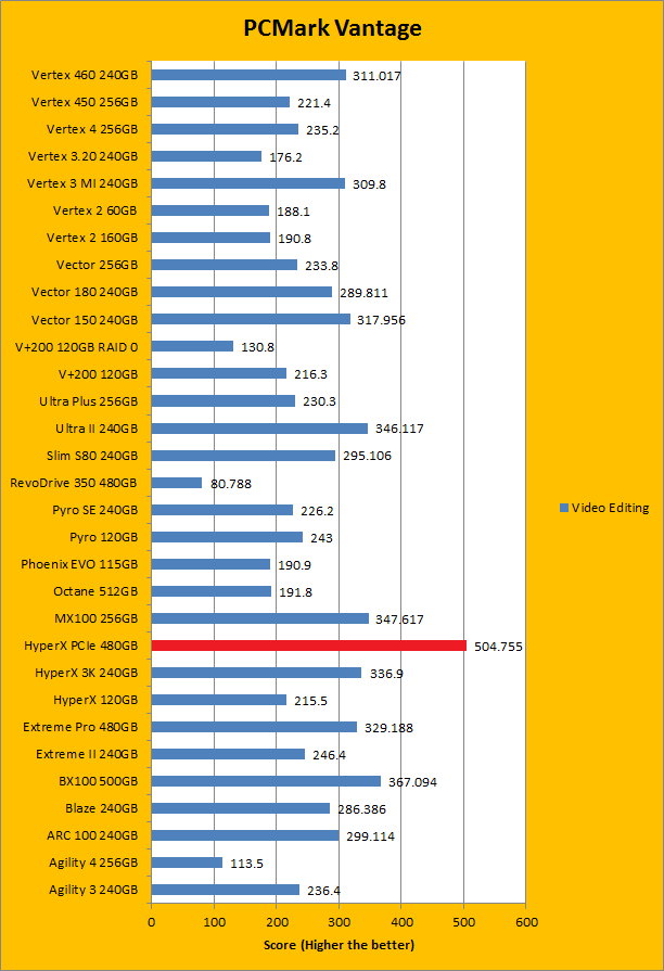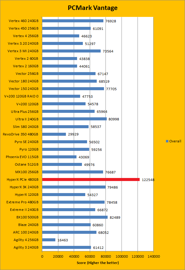 PCMark Vantage aims to shed a little more insight into real life performance of your computer hardware by semi-synthetic means -- and all insight is good, right? The great thing about standardized tests is anyone can repeat them and get very similar results, given identical hardware. Well, I am not going to narrate the stuff above in detail, because we all know graphs are there for a very good reason. Just to give you a bit of insight if you are too lazy to go through all nine comparisons, the Kingston HyperX Predator PCIe 480GB delivered the highest score in eight out of nine categories, with seven of them so far ahead, the competition did not even make a dot in its rear view mirror. PCMark Vantage uses some pretty simple simulations, so it is pretty optimized for drives with relatively fast linear read (It does funny things when you got a SandForce RAID array though). The results are downright impressive. The Kingston HyperX Predator PCIe 480GB is also the only drive to have ever cracked the 100K overall score at the time of writing this review.