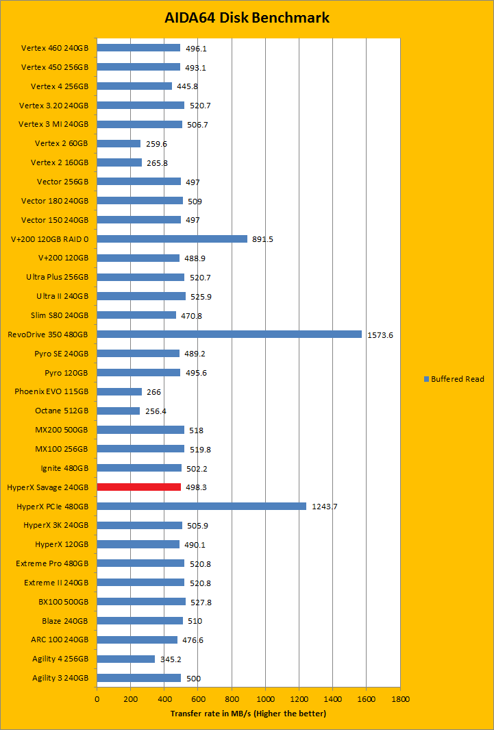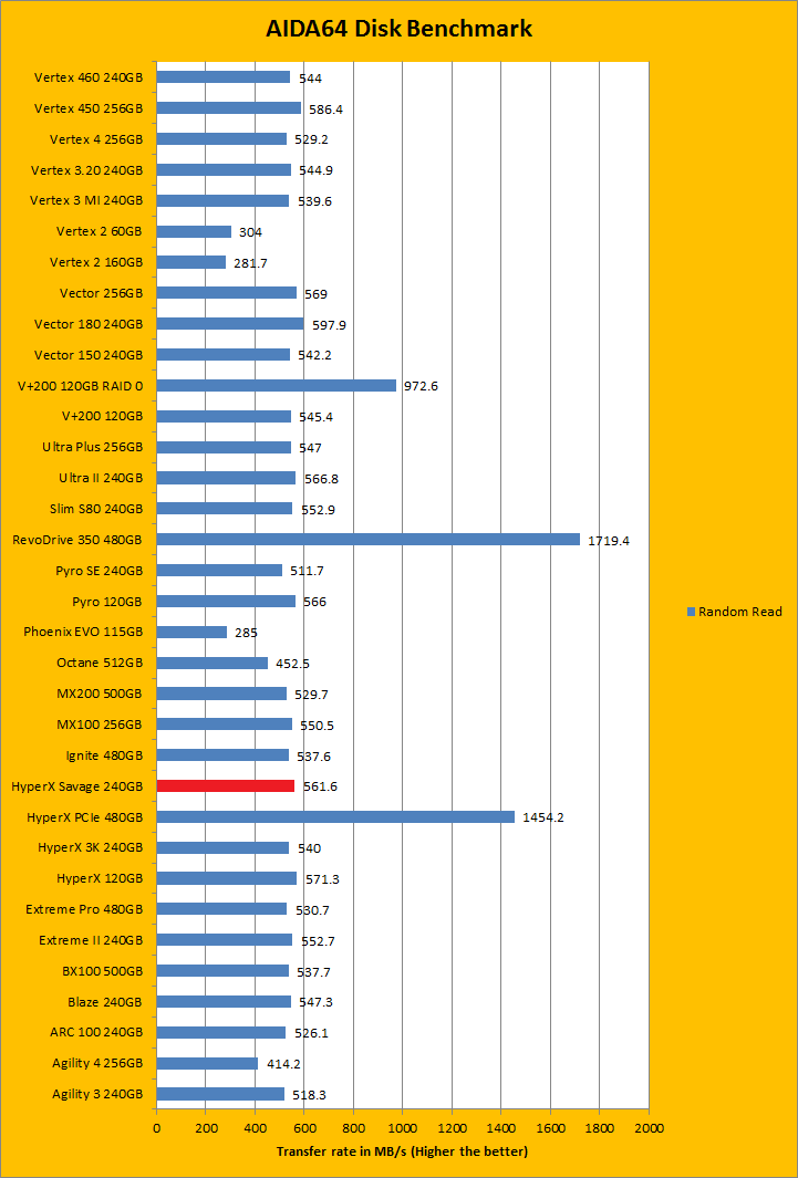 Since our SSD review benchmark results are presented in alphabetical order, first up on the list are results from one of our favorite benchmarking programs, AIDA64 Engineer. Just to note, AIDA64 Engineer is a full synthetic benchmark. Unlike full synthetic motor oil, this usually does not always carry a good connotation. While it is not a representation of real life performance (Such as how fast Photoshop opens), it does provide valuable insight into performance between different drives and different controllers. As you can see in our graphs above, the Kingston HyperX Savage 240GB was very similar to the Patriot Ignite 480GB, another Phison based drive with the same controller, with a slight advantage given to the HyperX Savage. Compared to other mainstream oriented drives in the category, the HyperX Savage remains to be competitive. The tested random access time was 0.02ms, which is one of the lowest we have ever seen. The rest of the comparison results against all the other drives can be seen in our graphs above.