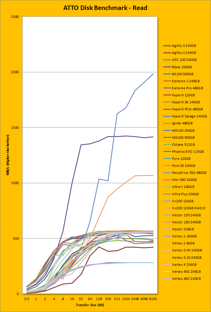 Following up next is our usual ATTO read and write tests. ATTO is an often quoted benchmark, because it is easy to use and accurate. For the most part, it is a favorite among reviewers, and I have grown to embrace it as much as the next for the last little while. ATTO uses easily compressible data, so SandForce based SSDs and similar will perform very well here; as far as the Phison PS3110-S10 is concerned -- well, here are our results. As manufacturer peak read and write performance ratings are usually obtained using ATTO, whether a drive lives up to its marketing claims or not can be validated by this program. Kingston claims the HyperX Savage 240GB's maximum read and maximum write are pinned at 560MB/s and 530MB/s, respectively. According to our tests, these numbers were slightly underrated. It peaked at 565.789MB/s read and 547.827MB/s write. Under the curve, it was very similar to the Patriot Ignite 480GB with the same drive controller. However, due to differences in flash memory chips used, there was some variance between these drives near the middle of the chart. The Kingston HyperX Savage 240GB's ramp up was quite a bit better than the ARC 100, BX100, and MX200 in the read category, although the Ultra II still remains to be the king. As for as write is concerned, the HyperX Savage's initial ramp up was not as fast as drives based on other controllers, but it quickly caught up in 8K and above.