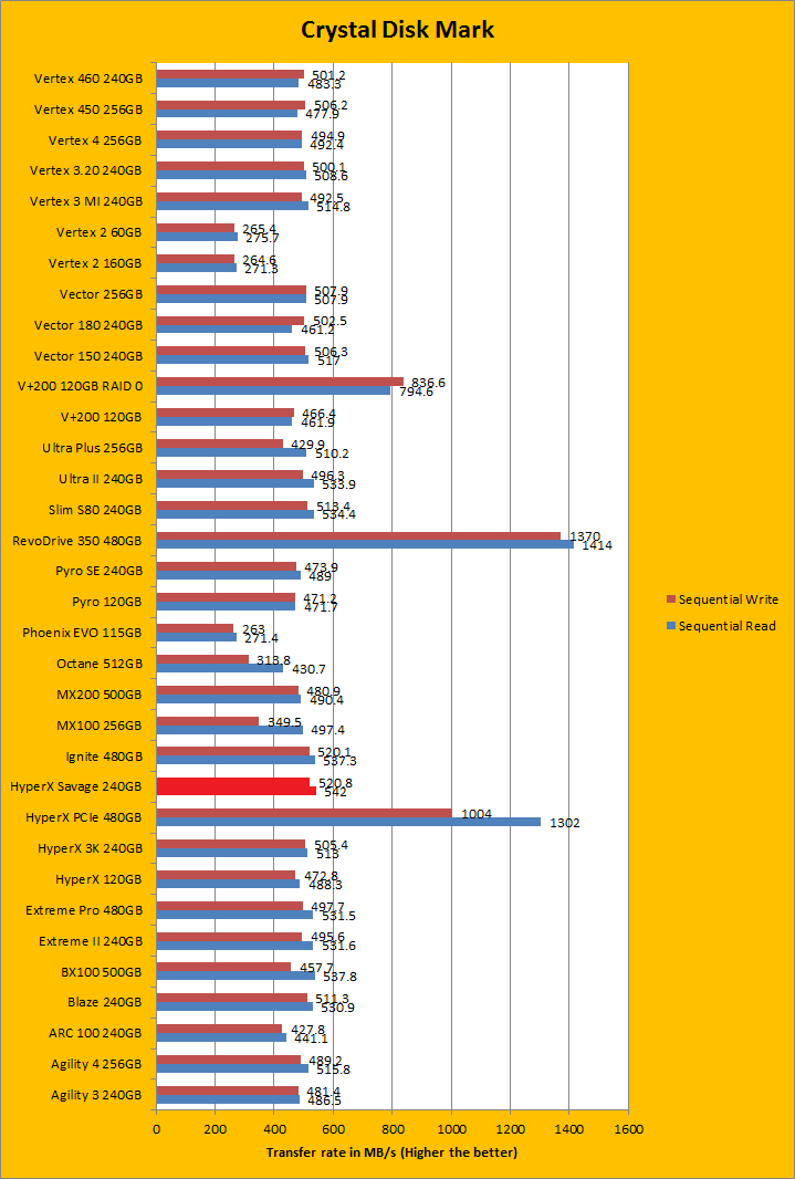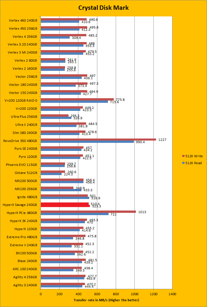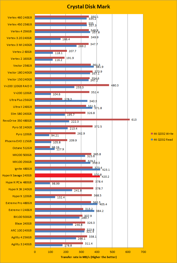 Crystal Disk Mark 3.0 is in the spotlight. Just a bit of background information; higher capacity drives tend to perform a little better in these tests. The ability of a controller and flash memory to deliver high IOPS will provide huge benefits to the score as well. The Kingston HyperX Savage 240GB is rated at 100,000 IOPS for read and 89,000 IOPS for write, which is pretty good. Looking at the results, it was almost identical to the Patriot Ignite 480GB almost across the board; with a minute advantage given to the HyperX Savage except for the 4K QD32 tests. The Patriot Ignite was one of the fastest single SATA based drives on our list in a number of results, and matching its controller-sharing cousin in Crystal Disk Mark was definitely a good thing. I will let you make your own comparisons in our massive list of SSDs in the graphs above.