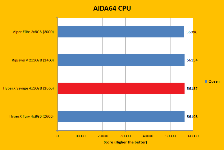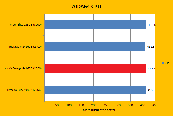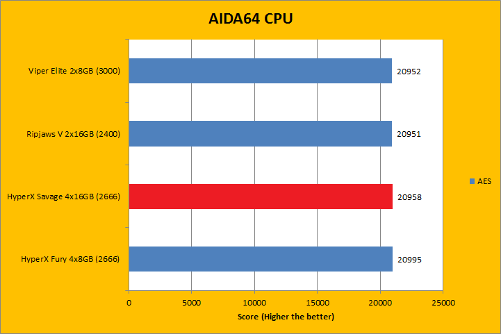 As always, our first set of benchmark results presented on the table are data obtained using AIDA64 CPU tests. Version 5.70.3800 (The latest release at press time; which can be downloaded from our Downloads page) results are comparable to recent previous releases. It was quite interesting how the products compared, because we had a varying combination of speed, capacity, and latencies. As far as how their performance went, all of them were close to each other in most tests, with the Kingston HyperX Savage Black HX426C15SBK4/64 4x16GB sitting at where we expected it to be in relative to the compared kits. AIDA64 did not gain much from stepping up your memory speed, with the exception of the PhotoWorxx results -- where the higher density 2x16GB kit from G.Skill had the biggest gain despite having the lowest memory bandwidth, as you can see in our graphs above.
