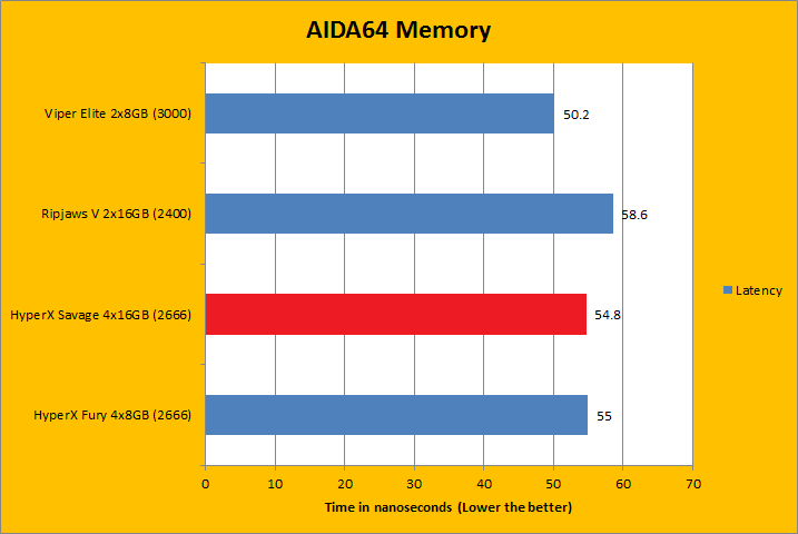 AIDA64's synthetic memory tests are the one next up to produce results for our review today. Traditionally, in pretty much all the benchmarks, see higher memory bandwidth RAM kits are generally favored -- whether it is the Copy, Write, or Read results. However, an even bigger favor was handed out to the G.Skill Ripjaws V 2x16GB kit, despite being only DDR4-2400, handily won every bandwidth benchmark. This was quite surprising. Operating at DDR4-3000, the Patriot Viper Elite PC4-24000 2x8GB came in at second place for every test, because first place went to the G.Skill Ripjaws V 2x16GB set -- while the two Kingston HyperX DDR4-2666 kits pretty much tied each other in third place.