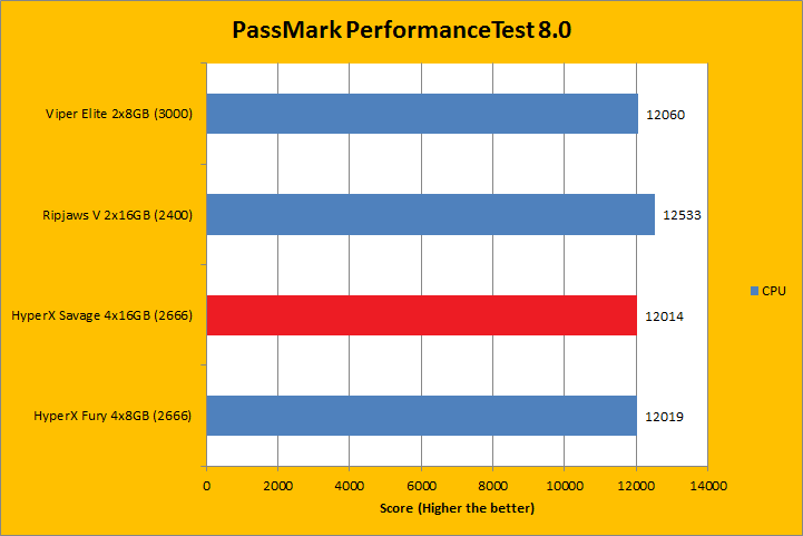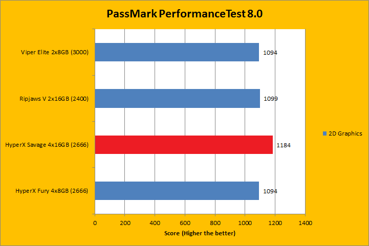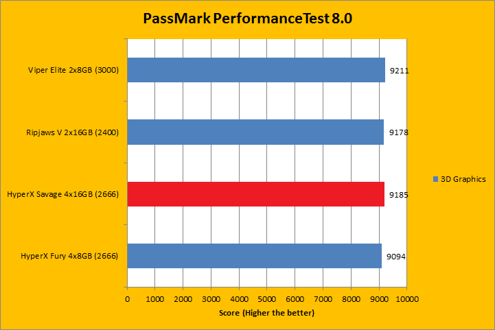 We run PassMark PerformanceTest 8.0 to evaluate four different areas of our system; coming down to the CPU, RAM, 2D Graphics, and 3D Graphics. It takes a somewhat different approach in obtaining results compared to other programs, which is why we like to use it, haha. PassMark Performance Test 8.0's memory benchmarking tool is the only test in our setup that takes memory capacity into account, but it did not seem to account for anything above 16GB. Usually, doubling the RAM will increase the score by about one and a half times, but the 64GB and 32GB kits here did not rank higher compared to the 16GB kits for its capacity. Like it was in AIDA64, the Ripjaws V 2x16GB took home the lead in the RAM benchmark. Other than that, most of the results were extremely close to each other, with the HyperX HX426C15SBK4/64 winning the 2D and 3D Graphics tests.