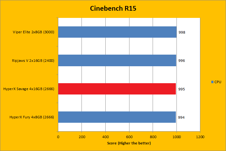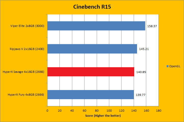Cinebench R15 is separated into two tests: One tests the CPU image rendering performance, while the other benchmarks the OpenGL video rendering performance. Obviously, having a fast processor and a powerful video card, respectively, will play a much more significant role in determining these scores, but that does not mean RAM does not do anything at all to contribute to these results. As you can see in our charts above, the Kingston HyperX Savage Black HX426C15SBK4/64 4x16GB did well in both tests; consistent with the rest in both the CPU and OpenGL benchmarks. If you have a Core i5, you will not see such a big variance in the results in relation to memory bandwidth. A Core i7, however, can take advantage of faster memory, as it did in this case.