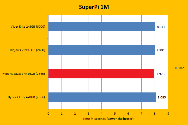 We have always included SuperPi in our benchmark results, because it is a quick and dirty run that always proves to be interesting. It is neither the fastest way to calculate Pi, nor is it the most challenging. But being an enthusiast at heart, this program has always provided interesting results for showing off your overclocking prowess at your favorite online forum. This time around, the Kingston HyperX Savage Black HX426C15SBK4/64 4x16GB won by a small fraction of a second against the others, albeit having DDR4-2400 and DDR4-3000 memory kits in the same test. First place is always a great place to be, especially considering the 64GB HyperX kit has a moderate frequency of only DDR4-2666.