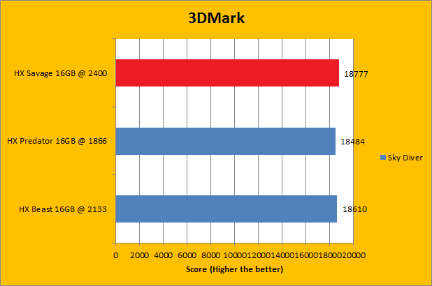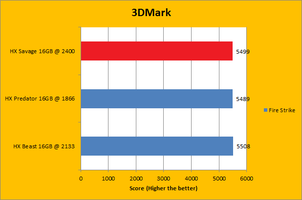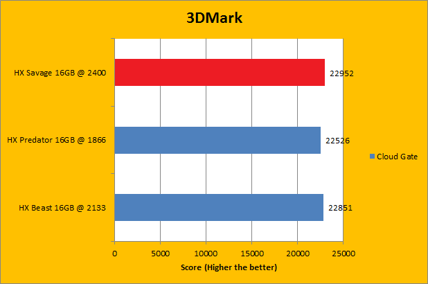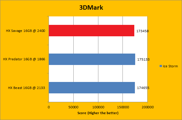 Like Futuremark's PCMark 8 benchmarking suite, 3DMark is yet another favorite among enthusiasts and reviewers alike. In fact, it has been part of the APH Networks' battery of standard benchmarks since the very beginning. The latest iteration of 3DMark is available in four presets. This includes Fire Strike, Sky Diver, Cloud Gate, and Ice Storm; each in decreasing order of GPU dependency. To give our test platform a little more CPU and RAM subsystem dependency, I did not enable the Extreme option in any of the tests. As you can see in our graphs above, the DDR3-2400 Kingston HyperX Savage HX324C11SRK2/16 2x8GB did not provide a whole lot of performance gain, if at all. Due to varying combinations of bandwidth and latencies, most of the tests ended up being statistical ties; the HyperX Savage won by a hair in some tests, and lost by a hair in others.