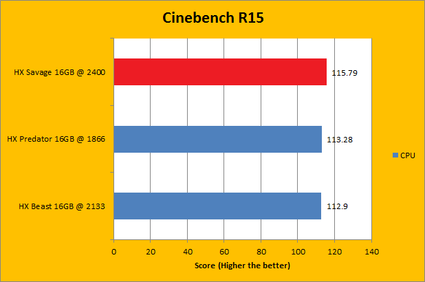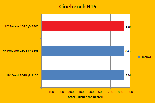 Cinebench R15 is separated into two tests: One tests the CPU image rendering performance, while the other benchmarks the OpenGL video rendering performance. Obviously, having a fast processor and a powerful video card, respectively, will play a much more significant role in determining these scores, but that does not mean RAM does not do anything at all to contribute to these results. As you can see in our charts above, the Kingston HyperX Savage HX324C11SRK2/16 2x8GB did very well in both tests; winning the CPU and OpenGL benchmark. That said, it is important to point out all of the tested kits came out extremely close to each other, despite frequency variance of approximately 534MHz between the fastest and slowest.