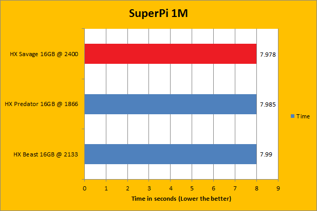 We have always included SuperPi in our benchmark results, because it is a quick and dirty run that always proves to be interesting. It is neither the fastest way to calculate Pi, nor is it the most challenging. But being an enthusiast at heart, this program has always provided interesting results for showing off your overclocking prowess at your favorite online forum. Once again, the Kingston HyperX Savage HX324C11SRK2/16 2x8GB produced the best result, but only by shaving off a hundredth of a second in the end.