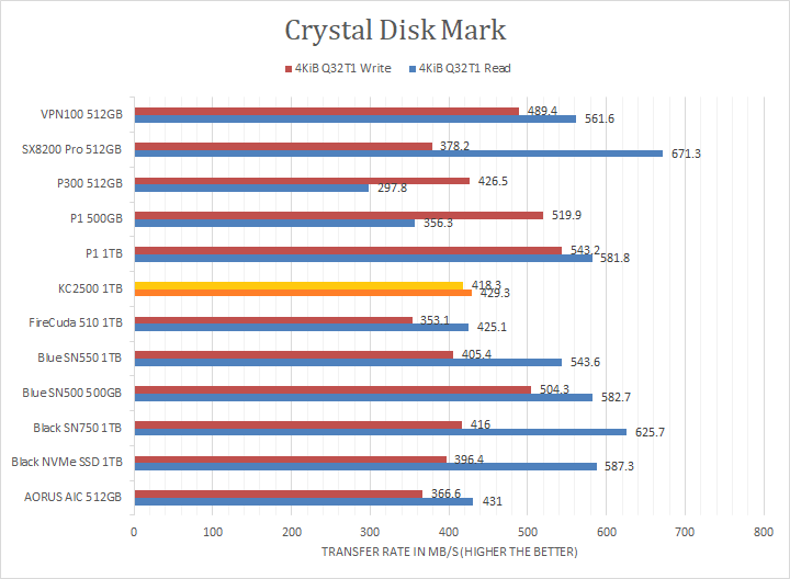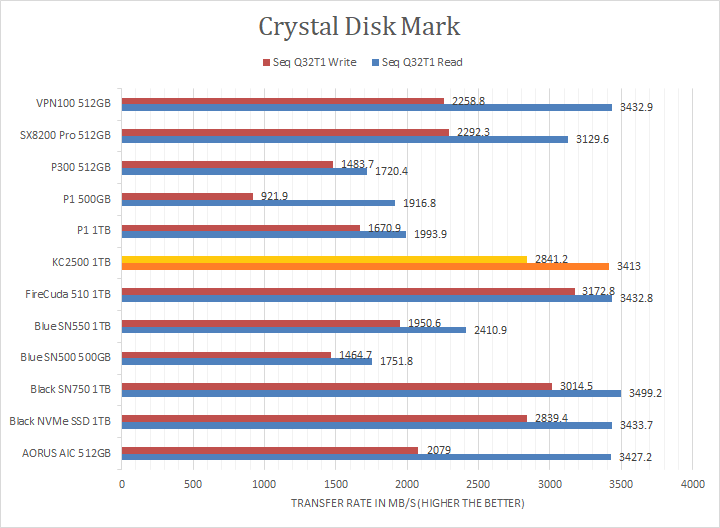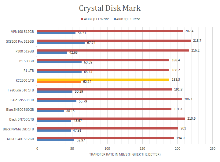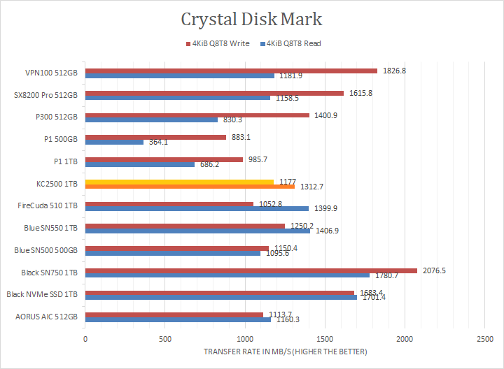Crystal Disk Mark 6.0 is in the spotlight. Just a bit of background information; higher capacity drives tend to perform a little better in these tests. The ability of a controller and flash memory to deliver high IOPS will provide huge benefits to the score as well. The Kingston KC2500 1TB is rated at up to 375,000 IOPS read and 300,000 IOPS write, which is not that high. Looking at the read and write results of all four sections, the KC2500 1TB scored in the second tier of sequential write speed here at APH Networks. Its sequential read speed was among the top and matched the advertised figures. Otherwise, its 4KiB Q8T8 read and write were not that ideal; scoring closer to the budget NVMe drives than the performance ones. The 4KiB Q32T1 read and write were near the back among the compared drives as well. Meanwhile, the 4KiB Q1T1 read and write gave no surprises. I will let you make your own comparisons in our list of SSDs in the graphs above.