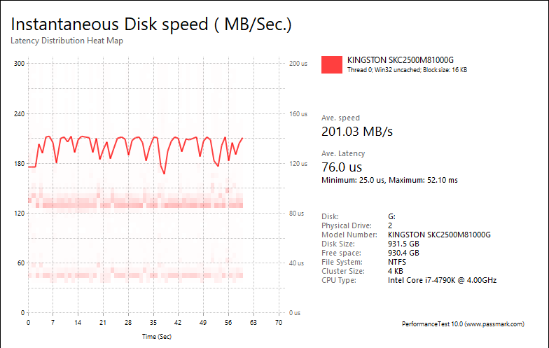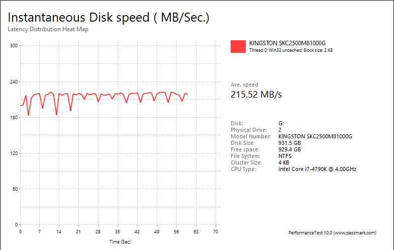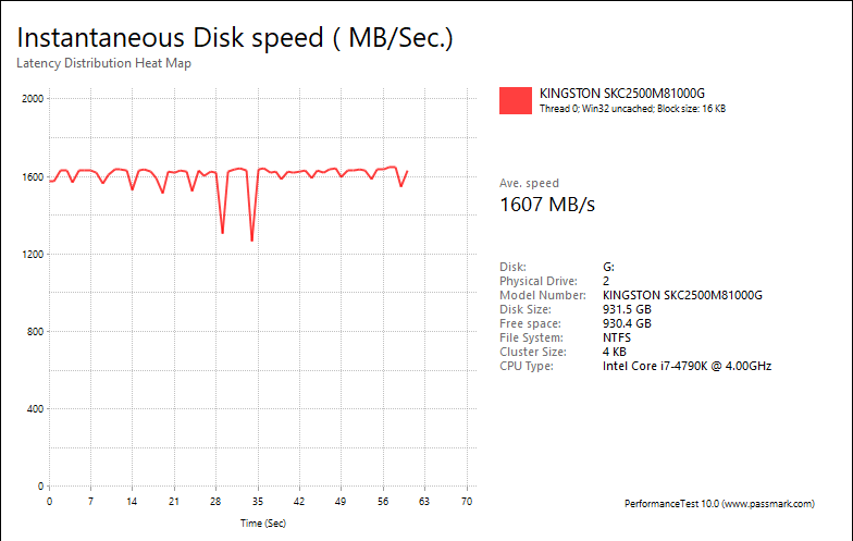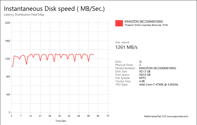 PassMark PerformanceTest 10's Advanced Disk Test, unlike HD Tune Pro 5.70, generates some awesome graphs right out of the box. It also provides valuable insight in simulating real world performance applications. To make things clear to you, the first graph simulates a database server, followed by a file server, web server, and workstation. Obviously, PassMark PerformanceTest 10 uses highly compressible data in most tests some controllers can really take advantage of. However, it also requires high IOPS capabilities for the best score. One thing clear is the Kingston KC2500 1TB provided generally flat graphs, which is excellent if you are looking for consistent performance.
