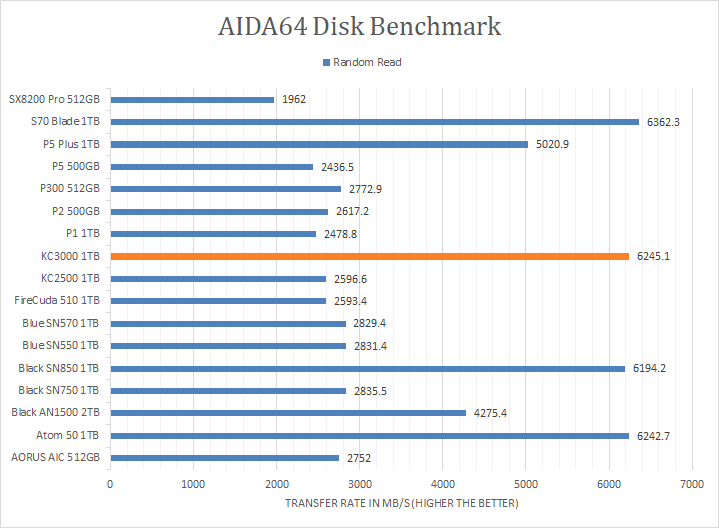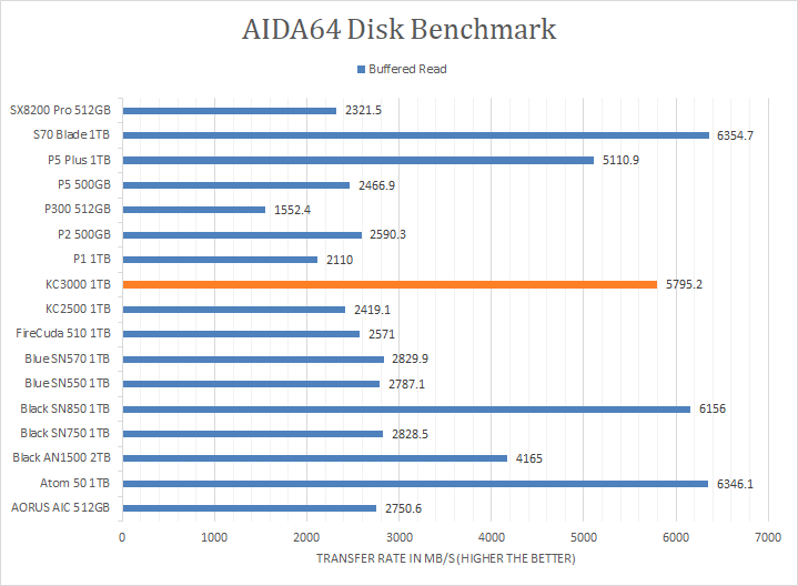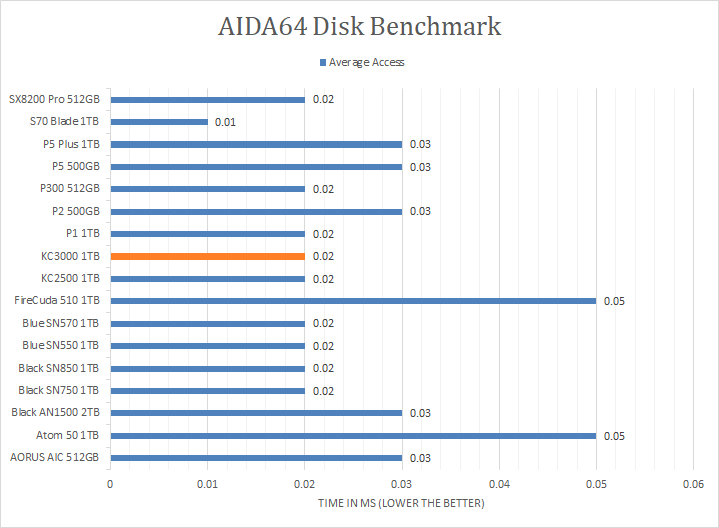 Since our SSD review benchmark results are presented in alphabetical order, first up on the list are results from one of our favorite benchmarking programs, AIDA64 Engineer. Version 6.60.5900, the latest release at press time, can be downloaded from our Downloads page. Just to note, AIDA64 Engineer is a full synthetic benchmark. Unlike full synthetic motor oil, this usually does not always carry a good connotation. While it is not a representation of real-life performance -- such as how fast Photoshop opens -- it does provide valuable insight into performance between different drives and different controllers. As you can see in our graphs above, the Kingston KC3000 1TB came in second in the linear read and random read tests, barely behind the PCIe 4.0-based XPG Gammix S70 Blade 1TB. It came in third in the buffered read test. The KC3000 scored consistently around the 6300MB/s mark in the linear read segment, and the tested latency was very low with an average of 0.02ms. The comparison results against all the other drives can be seen in our graphs above.