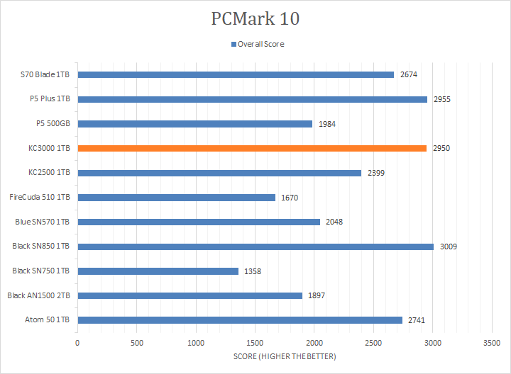 PCMark 10 is the latest version of the popular full system benchmark from UL. We used PCMark 10's Full System Drive Benchmark to test the performance of the Kingston KC3000 1TB. According to UL, the Full System Drive Benchmark uses a wide-ranging set of real-world traces from popular applications and common tasks to fully test the performance of the fastest modern drives. The following traces were used and defined as follows: