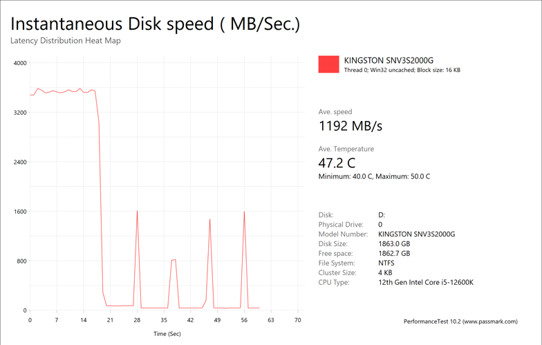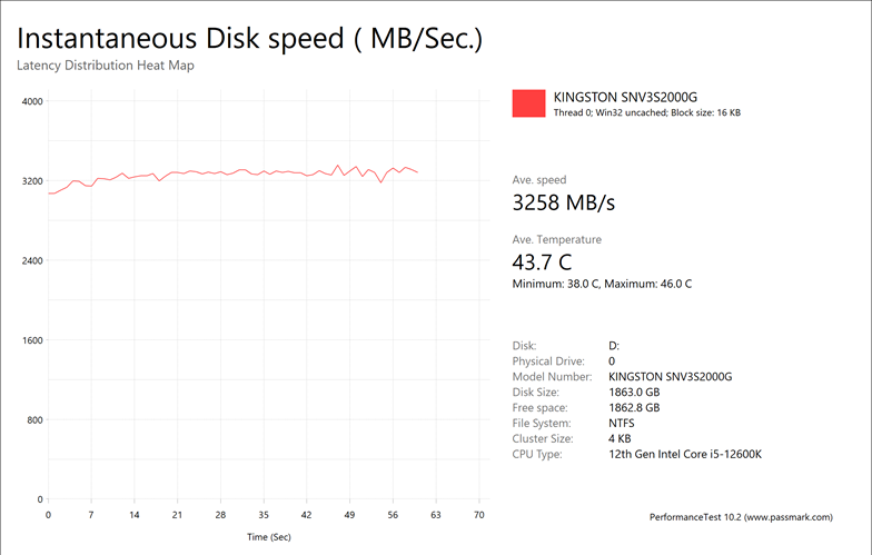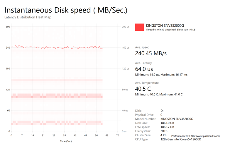 The Kingston NV3 2TB provided us with mixed results of 241.37MB/s, 3258MB/s, 1192MB/s, and 240.45MB/s. This seemed to be all over the place, as the file server tests were generally strong, the database and workstation was below average, and the web server test was quite a bit slower. It is not clear if this result was due to thermal throttling or running out of cache. Regardless, this is something that could result in performance drops for heavy reads and writes, which is something these tests simulate.