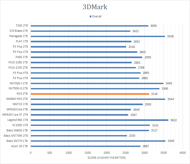 Like its PCMark 10 performance, the Kingston NV3 2TB provided slightly above average results, ranking ninth out of twenty-four overall. Once again, there was no overtly excellent or poor result, with each of the traces landing just above or just below the average. Interestingly, for tests that involve file transfer solely, and not any application usage, the Kingston NV3 2TB was slightly below the average, while every test with game usage scored slightly above the middle. As such, I was pleased with this result for a QLC-based DRAM-less budget drive.