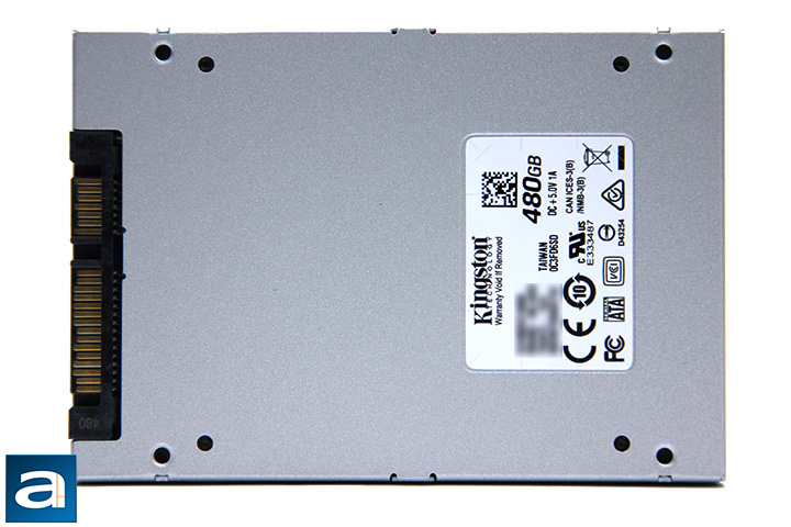 Turning the SSD around reveals more of its metal housing. This is something users will come to expect from a solid state drive, as there are no exposed printed circuit boards like you would normally see with a traditional hard disk. The only thing that is common between the Kingston SSDNow UV400 480GB SSD and a traditional hard disk drive is its SATA 6Gb/s and corresponding power connector at the end. As shown in our photo above, you will find a large label with the usual series of certification logos, along with information such as the brand, capacity, and serial number. In case you missed it, our particular unit is the Kingston SSDNow UV400 480GB, haha. Like many SSDs we have reviewed in the past, this Kingston drive is made in Taiwan.