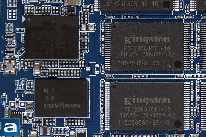 A total of sixteen NAND flash chips are found on the Kingston SSDNow UV400 480GB solid state disk, with eight of them on each side. The chips used are Kingston branded flash memory labeled FD32B08UCT1-10, with a capacity of 32GB per integrated circuit chip. These are the same as Toshiba's TH58TEG8THLTA20, which are triple-level cells manufactured on the 15nm fabrication process also found in the OCZ Trion 150 480GB. Its rated write endurance is 200TB, which equates to about 110GB per day for five years. This is actually really good, considering it is more than some high end drives out there. 32GB out of the 512GB total capacity (Just under 7%) is provisioned for the drive controller for overhead, so the actual usable space is 480GB, as advertised. You will see 447GB in Windows. One Nanya NT5CC256M16CP-D1 512MB DDR3L-1600 chip is present; used with the Marvell 88SS1074 controller to ensure smooth operation.