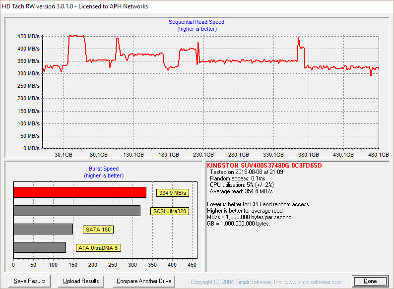 After giving the Kingston SSDNow UV400 480GB a clean format and ensuring alignment and everything is correct, I fired it up for some testing in HD Tach. While HD Tach is more of a 'drag race' than a clear indication of real life performance, and has been around for a really long time, it is an excellent storage performance reference among SSDs with the same controller, and has been our favorite benchmark long before hard drives even cracked the 50MB/s mark. With an average read speed of 354.4MB/s according to HD Tach in single disk configuration, this score is decent, and almost identical to the Crucial MX300 750GB, but nothing to write home about (The SanDisk Ultra II 240GB is the fastest single SATA 6Gb/s disk at 469.3MB/s, while the OCZ RD400A 512GB is the record holder at 1109.7MB/s). Just for reference, the OCZ Trion 150 480GB posted a score of 423.9MB/s. For most solid state drives, we typically look for something that is faster than 350MB/s. From our experience, most drives do not crack the 400MB/s line. At the end of the day, HD Tach may not be the best test for solid state drives all the time, but we really cannot argue against the results.