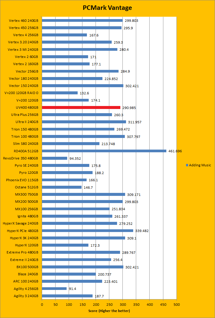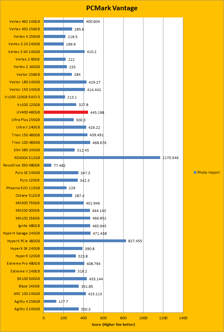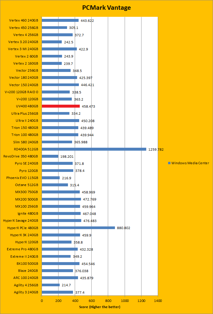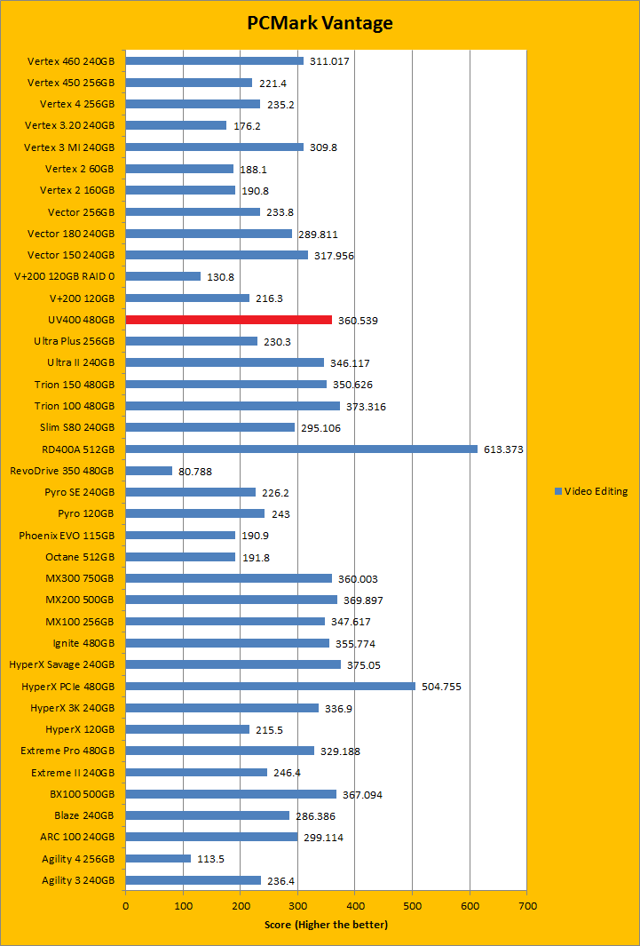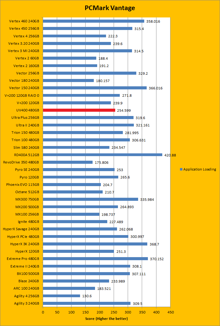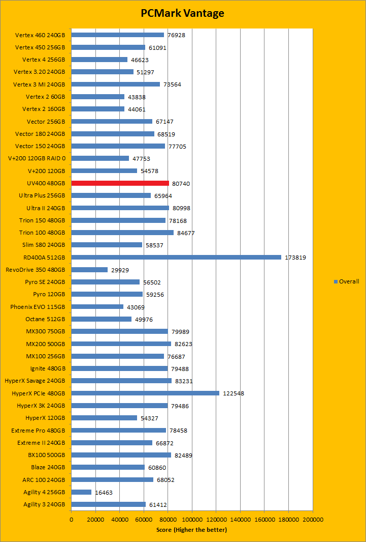 PCMark Vantage aims to shed a little more insight into real life performance of your computer hardware by semi-synthetic means -- and all insight is good, right? The great thing about standardized tests is anyone can repeat them and get very similar results, given identical hardware. Well, I am not going to narrate the stuff above in detail, because we all know graphs are there for a very good reason. Just to give you a bit of insight if you are too lazy to go through all nine comparisons, the Kingston SSDNow UV400 480GB delivered an overall score among the top for a SATA 6Gb/s drive. PCMark Vantage uses some pretty simple simulations, so it is pretty optimized for drives with relatively fast linear read (It does funny things when you got a SandForce RAID array though). The results were pretty good. In the subcategories, the Kingston SSDNow UV400 480GB was faster than both the OCZ Trion 150 480GB and Crucial MX300 750GB by various margins in four out of eight categories, and tied for the better in the remaining four categories. This is really good, and its general performance was very commendable in PCMark Vantage.