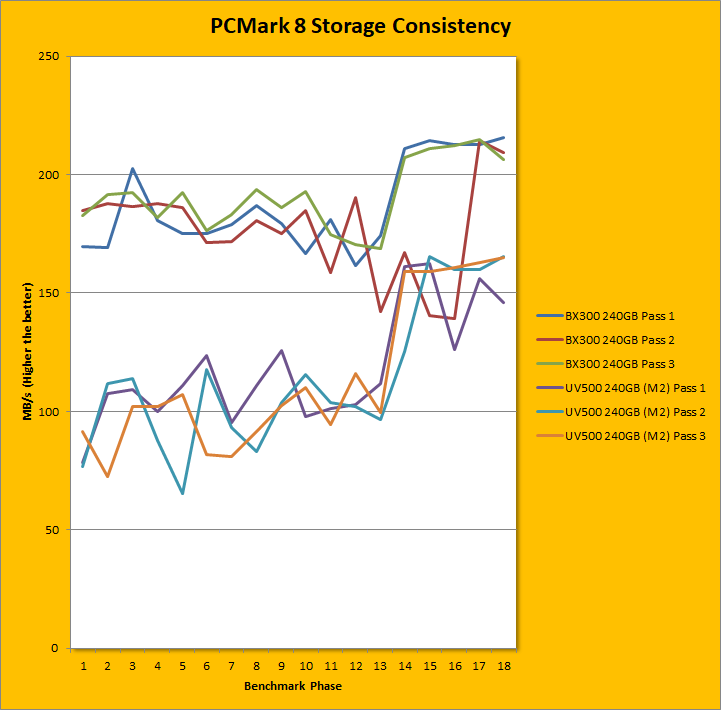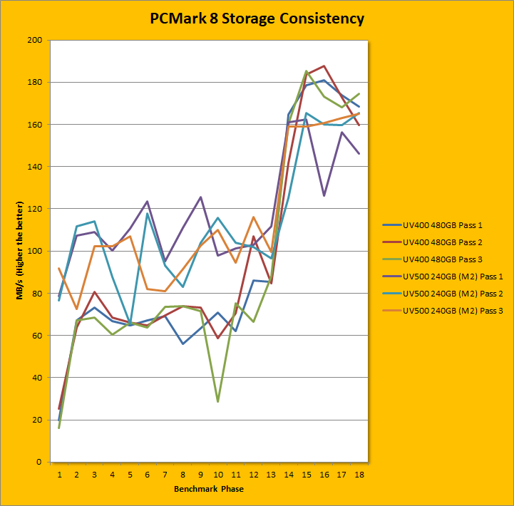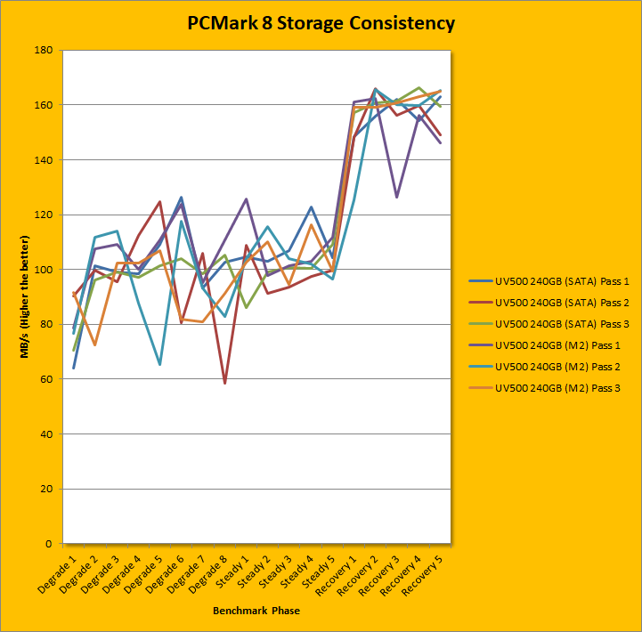 PCMark 8 Storage Consistency Test is one of our favorite benchmarks. Nowadays, many drives are well optimized for high benchmark scores when they are empty, but what separates the professional players from the amateurs is how it stands up to a truly punishing workload. PCMark 8's Storage Consistency Test is designed exactly for this purpose. Going through five phases -- precondition, degradation, steady state, recovery, and clean up -- to extend beyond real world application simulations, this benchmark takes just over two days to complete, but the results are revealing of a SSD's true capabilities. Overall, the Kingston UV500 240GB's results were pretty poor for its class. There was no appreciable difference between the M.2 and SATA variants in the first chart. In the second chart, where it was compared against the UV400, the UV500 was, on average, 57% and 40% faster in its degradation and steady phases, respectively, compared to its predecessor, but 8% slower in the recovery phase. This is a significant improvement. In the third chart, where it was compared against the Crucial BX300 240GB, the UV500 was, on average, 46%, 41%, and 21% slower in its degradation, steady, and recovery phases, respectively. It was simply no match for the BX300.