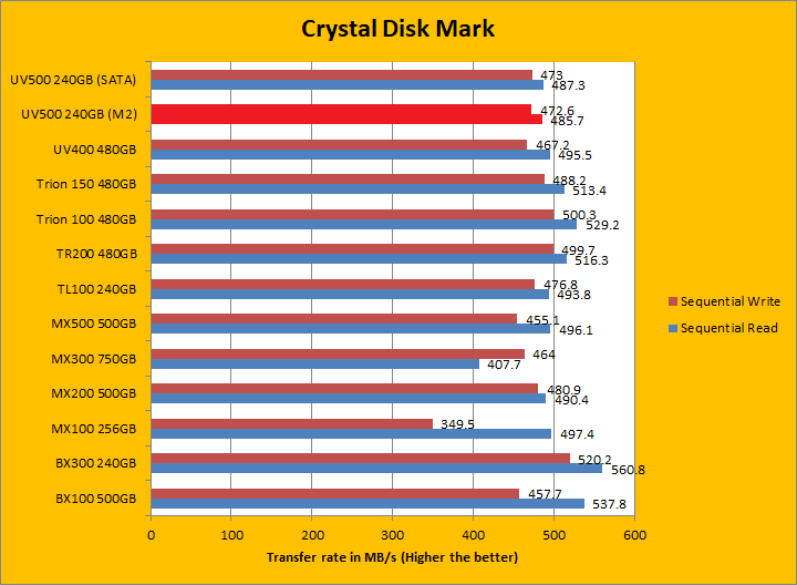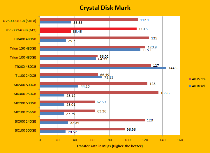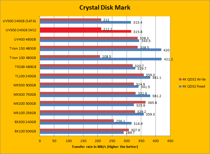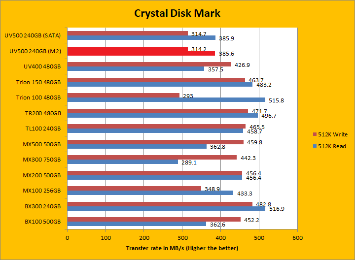 Crystal Disk Mark 3.0 is in the spotlight. Just a bit of background information; higher capacity drives tend to perform a little better in these tests. The ability of a controller and flash memory to deliver high IOPS will provide huge benefits to the score as well. The Kingston UV500 240GB is rated at up to 79,000 IOPS, which I assume is its read rating. Looking at the sequential read and write results, the Kingston UV500 240GB was quite competitive with others in its class; trading punches here and there. In the 512K section, was beaten by the same capacity Crucial BX300 and the larger capacity UV500. For the 4K results, the UV500's read performance was a highlight; beating out the UV400 and the BX300. Unfortunately, this did not carry though into the 4K QD32 test, although its read speed was just a hair behind the BX300 240GB. I will let you make your own comparisons in our massive list of SSDs in the graphs above.