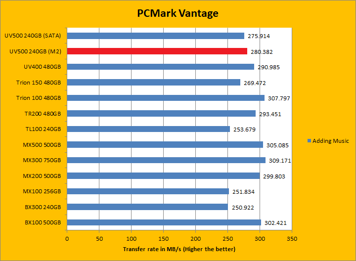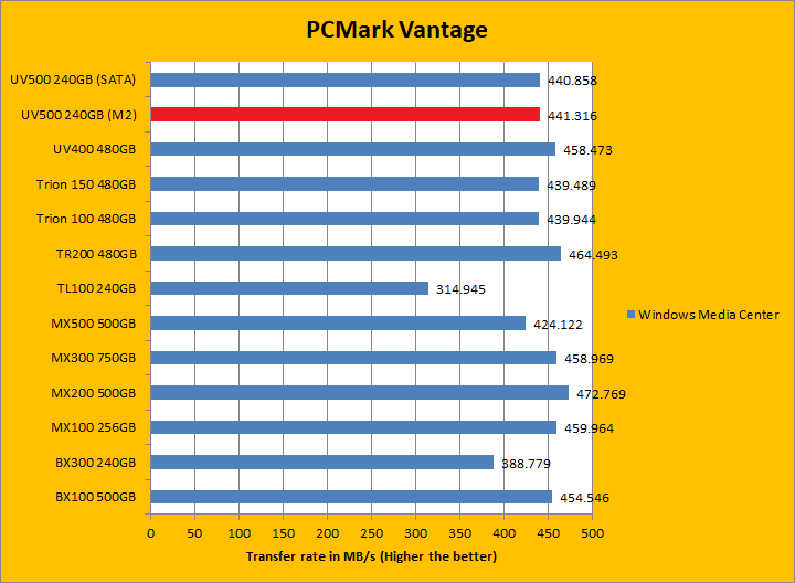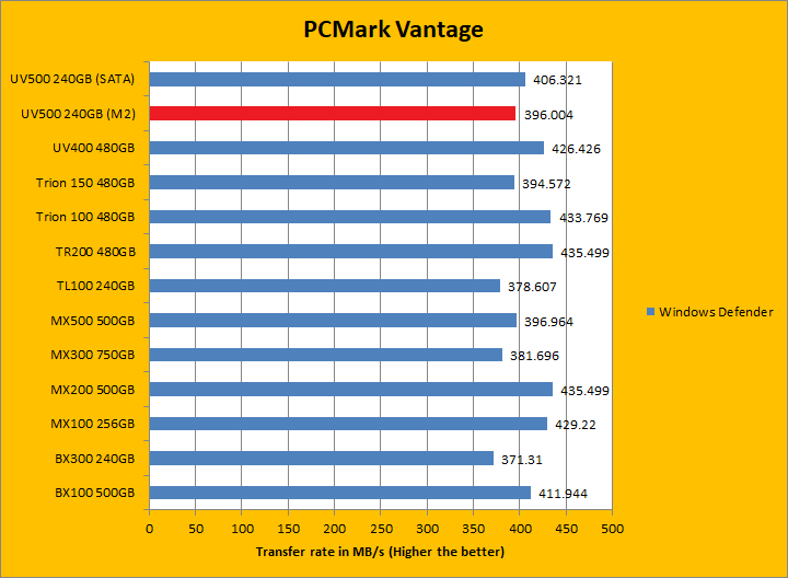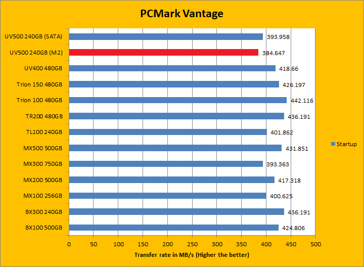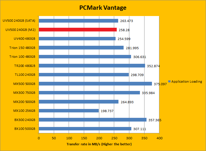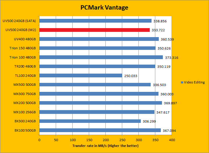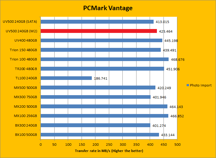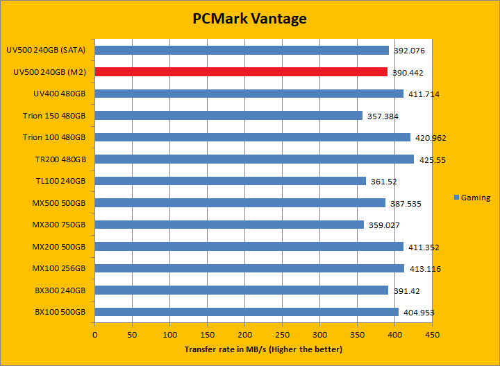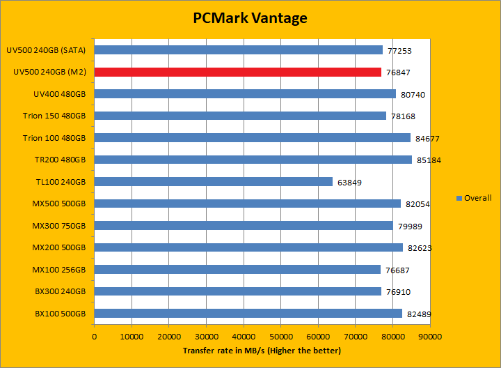PCMark Vantage aims to shed a little more insight into real life performance of your computer hardware by semi-synthetic means -- and all insight is good, right? The great thing about standardized tests is anyone can repeat them and get very similar results, given identical hardware. Well, I am not going to narrate the stuff above in detail, because we all know graphs are there for a very good reason. Just to give you a bit of insight if you are too lazy to go through all nine comparisons, the Kingston UV500 240GB (M.2) came in behind both the UV400 and UV500 (SATA) by a small margin. PCMark Vantage uses some pretty simple simulations, so it is pretty optimized for drives with relatively fast linear read. The results were pretty good. In the subcategories, the UV500 unfortunately lost all but one test compared to its predecessor, but won five of eight against the BX300 and three of eight against the MX500 of various margins. Both the BX300 and MX500 came out ahead overall compared to the UV500 though.