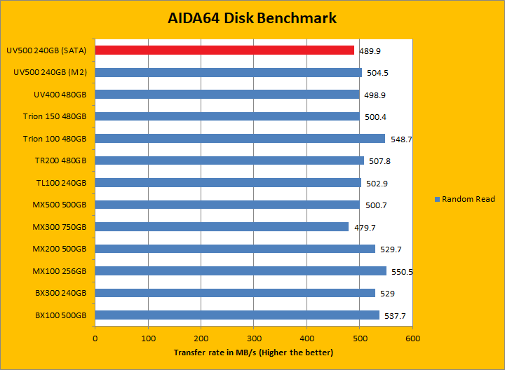 Since our SSD review benchmark results are presented in alphabetical order, first up on the list are results from one of our favorite benchmarking programs, AIDA64 Engineer. Just to note, AIDA64 Engineer is a full synthetic benchmark. Unlike full synthetic motor oil, this usually does not always carry a good connotation. While it is not a representation of real life performance -- such as how fast Photoshop opens -- it does provide valuable insight into performance between different drives and different controllers. As you can see in our graphs above, the Kingston UV500 240GB (mSATA), same as the 2.5" SATA version, was very similar to the UV400 480GB, with a slight advantage given to the UV400. The M2 UV500 was slightly faster in Linear Read and Random Read. Compared to other budget oriented drives in the category, the UV500 remained to be competitive. The tested random access time was 0.03ms, which was a step back from its predecessor. The rest of the comparison results against all the other drives can be seen in our graphs above.
