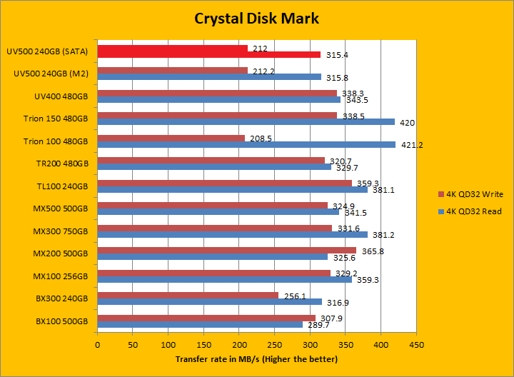 Crystal Disk Mark 3.0 is in the spotlight. Just a bit of background information; higher capacity drives tend to perform a little better in these tests. The ability of a controller and flash memory to deliver high IOPS will provide huge benefits to the score as well. The Kingston UV500 240GB is rated at up to 79,000 IOPS, which I assume is its read rating. Looking at the sequential read and write results, the Kingston UV500 240GB was quite competitive with others in its class; trading punches here and there. In the 512K section, was beaten by the same capacity Crucial BX300 and the larger capacity UV500. For the 4K results, the UV500's read performance was a highlight; beating out the UV400 and the BX300. Unfortunately, this did not carry though into the 4K QD32 test, although its read speed was just a hair behind the BX300 240GB. I will let you make your own comparisons in our massive list of SSDs in the graphs above.