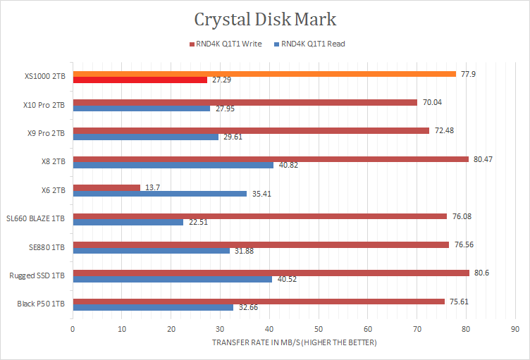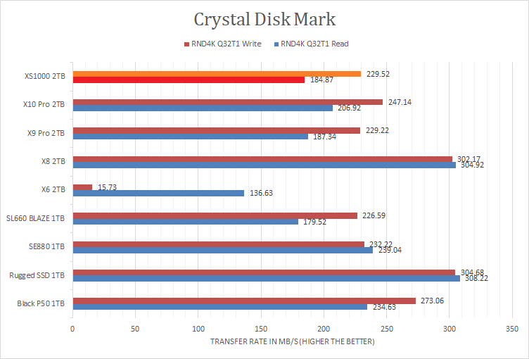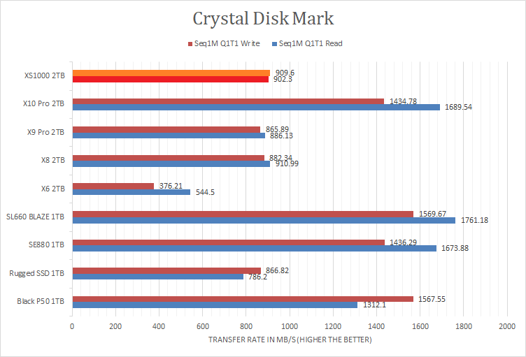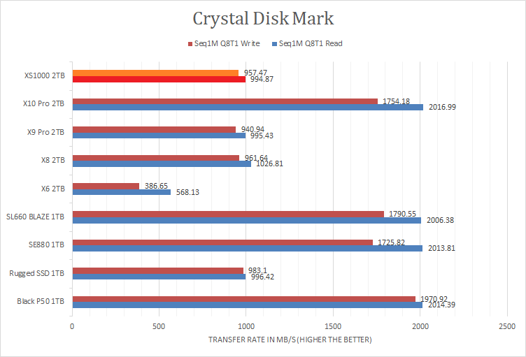 The Kingston XS1000 did slightly better than the X9 Pro in some of Crystal Disk Mark 8.0 tests while slightly lagging behind the obvious USB 3.2 Gen 2x2 SSDs that are in a different performance class. The sequential read speeds were almost identical between the XS1000 and X9 Pro, coming at 994.87MB/s for the XS1000 and 995.43 MB/s for the X9 Pro. On the other hand, the XS1000 had the slight upper hand in the write speeds. The XS1000 scored 957MB/s for the Seq1M Q8T1 test, while the X9 Pro scored 940MB/s. The XS1000 did well in these benchmarks, slightly outperforming similar drives in its class.