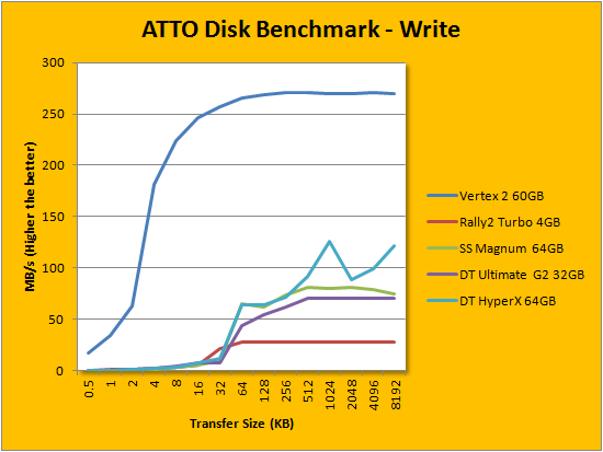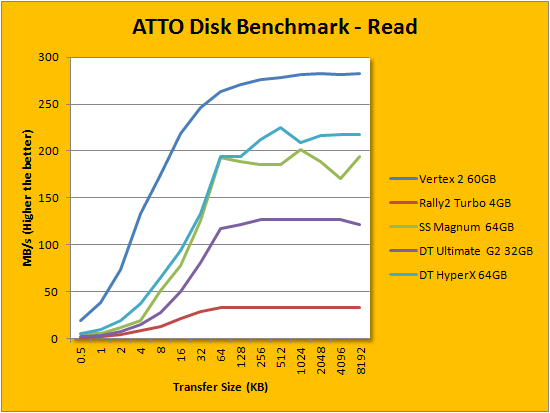 ATTO is one of my favorite benchmarks for quite a while. Ever since we have started using it in my network attached storage reviews last year, it has been integral to our battery of storage performance evaluations here at APH Networks -- mainly due to its accuracy, and thorough testing in accordance to varying transfer sizes. As you can see on our graphs above, its read performance greatly exceeds its write performance; peaking at 217MB/s and 126MB/s, respectively. In other words, Kingston's internal testing claims are quite accurate. Actually, it is consistently faster than the Patriot Supersonic Magnum 64GB across the curve, which is very impressive. I cannot explain the dips in near the end of both charts, but we are not the only review website with similar ATTO results.