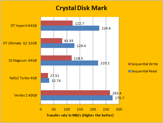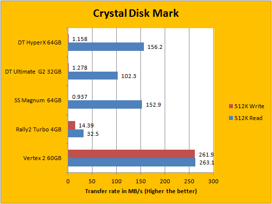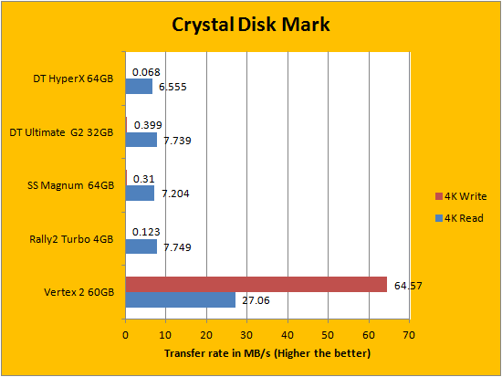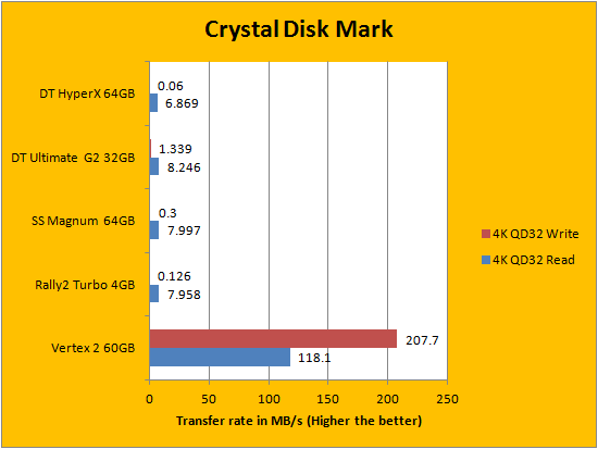 The same pattern continues on for the Kingston DataTraveler HyperX 3.0 64GB USB 3.0 flash drive as we move onto our Crystal Disk Mark results. Once again, it performed superbly in sequential read and write benchmarks, and even managed to edge out the Supersonic Magnum. However, the DataTraveler HyperX's its Achilles' heel is random small file performance, which requires high input/out operations per second (Commonly referred to as IOPS). This is no different than other USB 3.0 flash drives we have tested in the past, but for some reason, the Kingston DataTraveler HyperX 3.0 64GB is especially slow in 4K and 4K QD32 writes. This is one area we would definitely like to see improvement on, although for most users, the real world performance based on the intended usage of a USB flash drive probably will not be a significant issue.