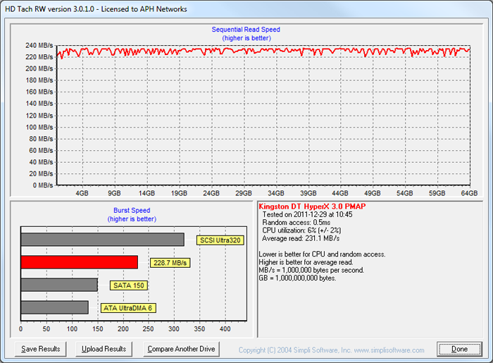 While HD Tach's sequential read performance is more of a 'drag race' approach to evaluating storage performance, it still provides valuable insight into how good a drive is compared to the next. From that above, I was able to pull an impressive 231.1MB/s sequential read speed in a flat line. This is pretty much SSD level, and a statistical tie with the Supersonic Magnum -- if you look at HD Tach results for SandForce SF-1222 based drives in our previous reviews (See: OCZ Vertex 2 60GB review, OCZ Vertex 2 160GB 25nm review, G.SKILL Phoenix EVO 115GB review), it is strikingly close. It is also quite a bit faster than the DataTraveler Ultimate G2's results of 184.3MB/s in the same test. For what it's worth, this is probably not going to be indicative of real life performance by any means, but at the end of the day, these numbers are certainly something we would not even have dreamed of three years ago.